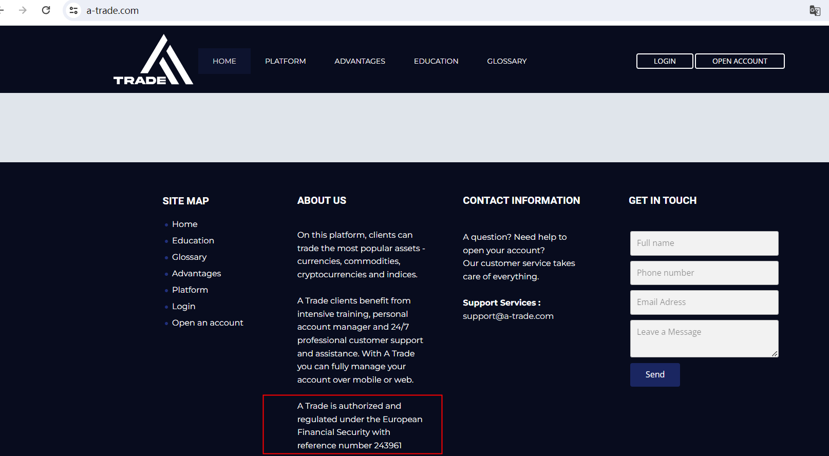 A Trade purports to be registered with an entity known as European Financial Security, citing reference number 243961. However, it's important to highlight that no such institution exists in Europe, rendering the verification of its legitimacy impossible. This suggests that the broker may be providing false regulatory information to appear credible and deceive unsuspecting investors.