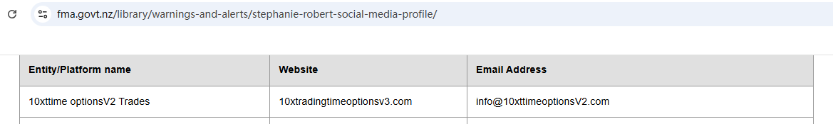 On May 5, 2025, the New Zealand Financial Markets Authority (NZ FMA) added 10xttime optionsV2 Trades to its warning list, stating that this is a fake investment platform. https://www.fma.govt.nz/library/warnings-and-alerts/stephanie-robert-social-media-profile/