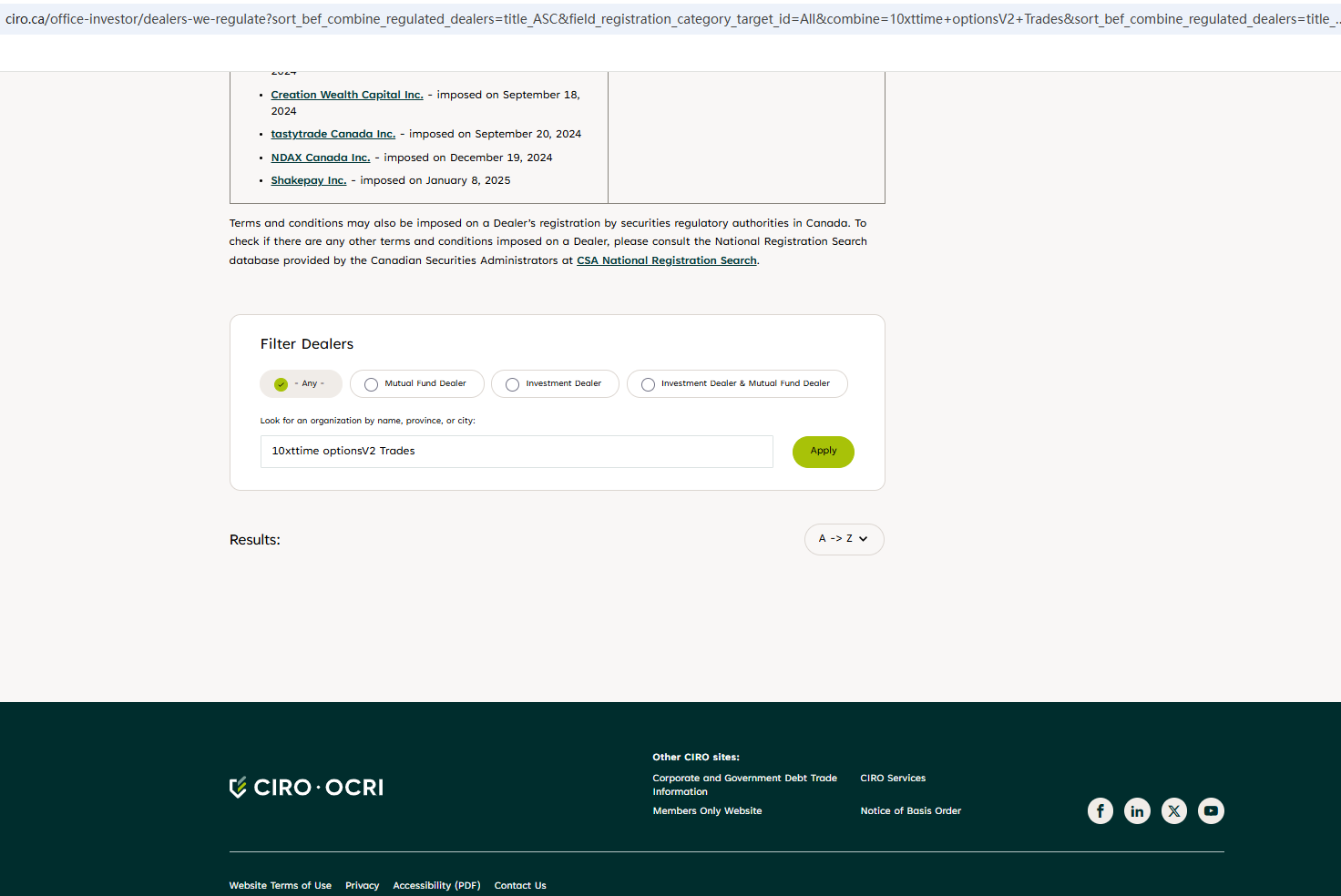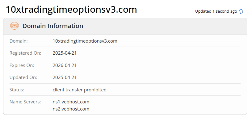 According to its website, it has offices in both the United States and Canada. Upon investigation, no matching information was found in the National Futures Association (NFA) and Investment Industry Regulatory Organization of Canada (IIROC). More importantly, we found that the domain name registration time was 2025, which clearly shows that it was created in a hurry. In addition, the New Zealand Financial Markets Authority (NZ FMA) added 10xttime optionsV2 Trades to its warning list, stating that this is a fake investment platform.