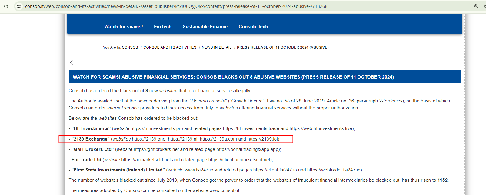 On October 11, 2024, the Italian Companies and Exchange Commission (CONSOB) ordered 2139 Exchange's website to be blacked out since it offers financial services illegally in Italy. https://www.consob.it/web/consob-and-its-activities/news-in-detail/-/asset_publisher/kcxlUuOyjO9x/content/press-release-of-11-october-2024-abusive-/718268