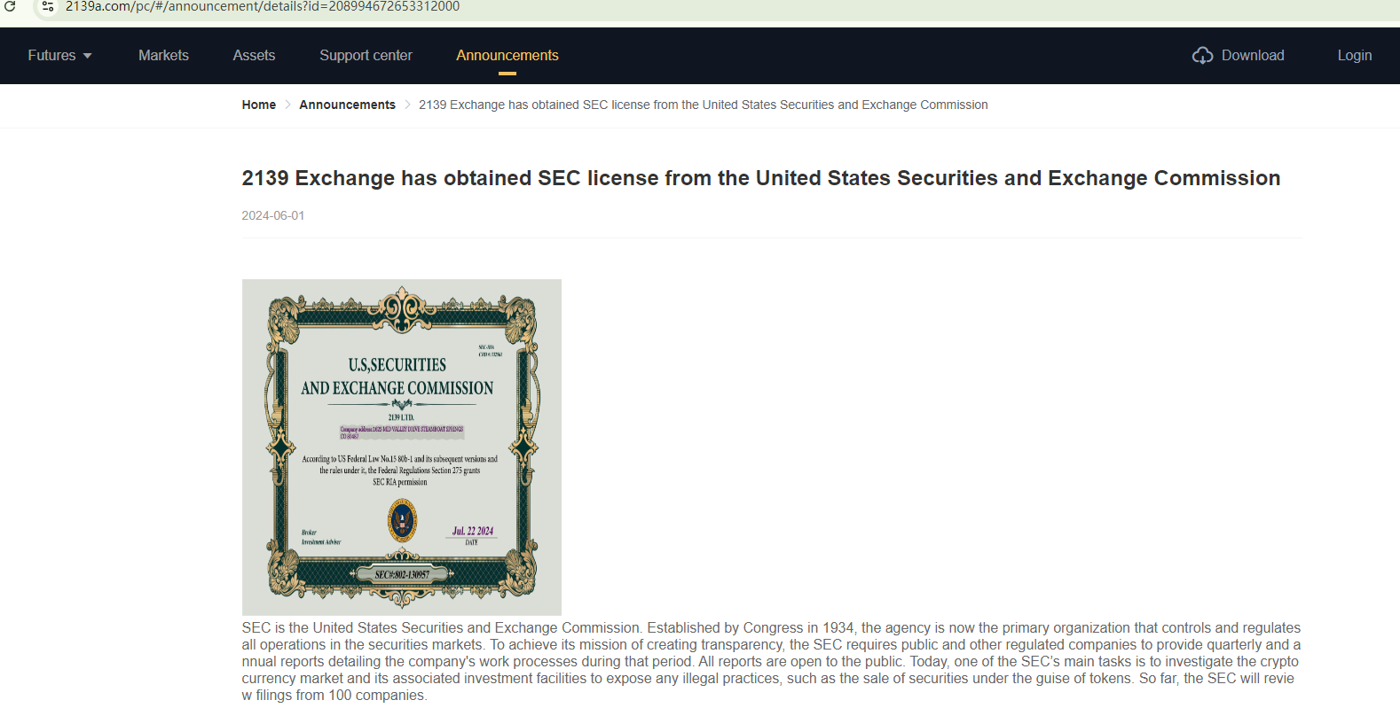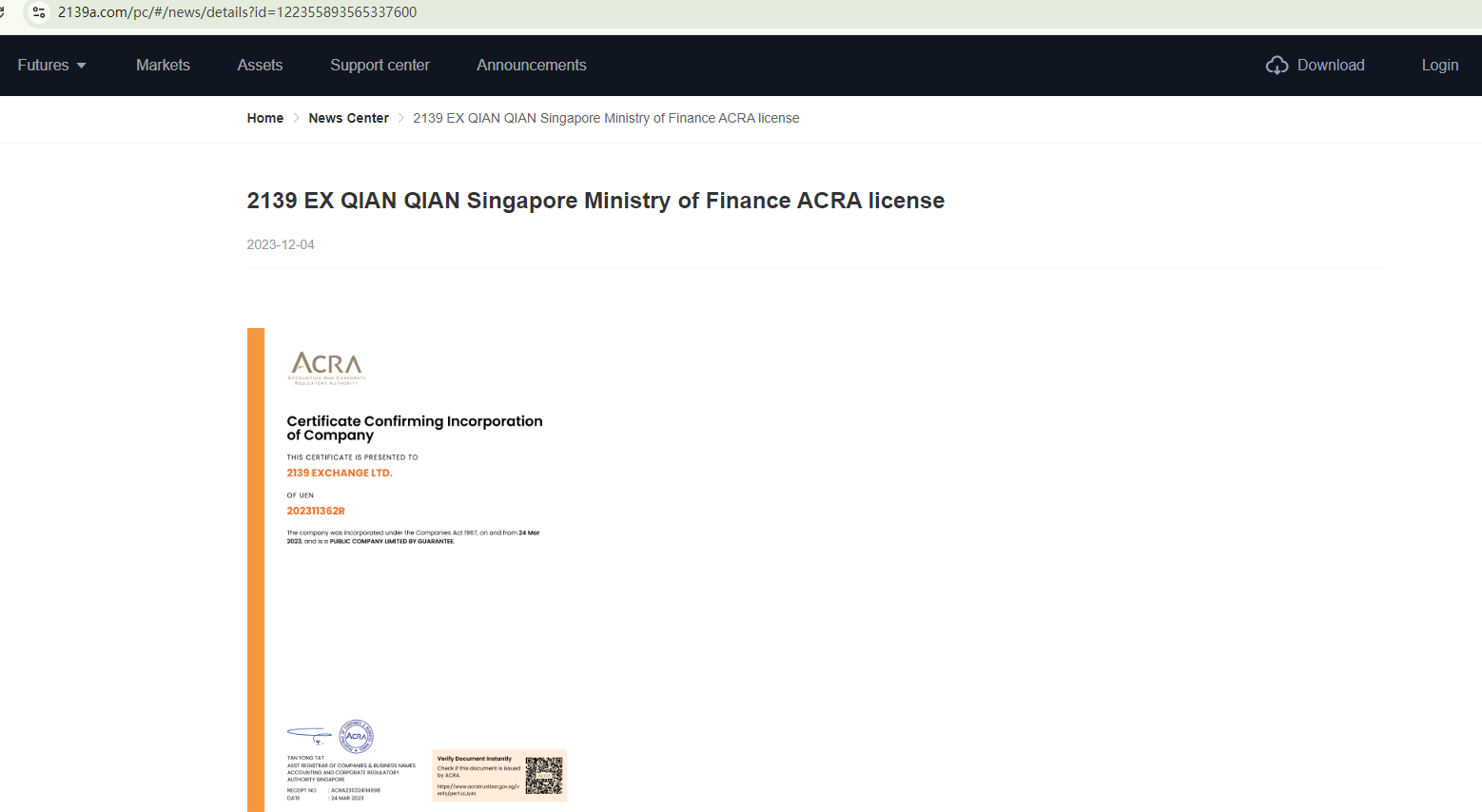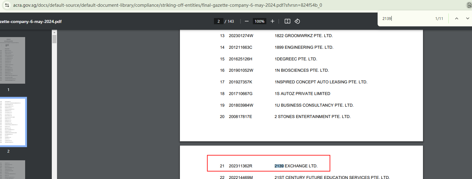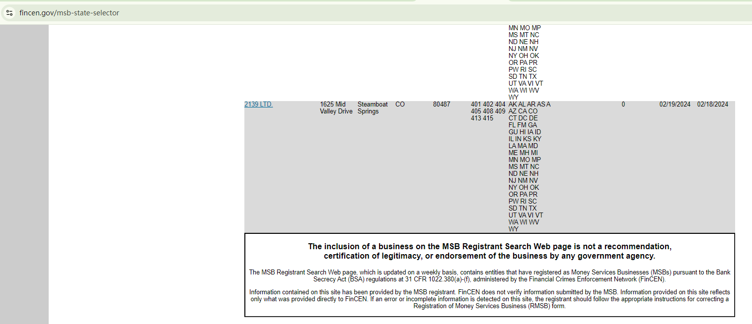 2139 Exchange falsely claims to be registered with the Accounting and Corporate Regulatory Authority (ACRA) and the U.S. Securities and Exchange Commission (SEC). We have confirmed that it is not currently registered with either authority. Additionally, although the company purports to have MSB registration with the Financial Crime Enforcement Network (FinCEN), it's essential to note that this registration doesn't constitute an endorsement or authorization from the government. Without valid evidence of proper licensing, 2139 Exchange is considered an unlicensed trading platform.