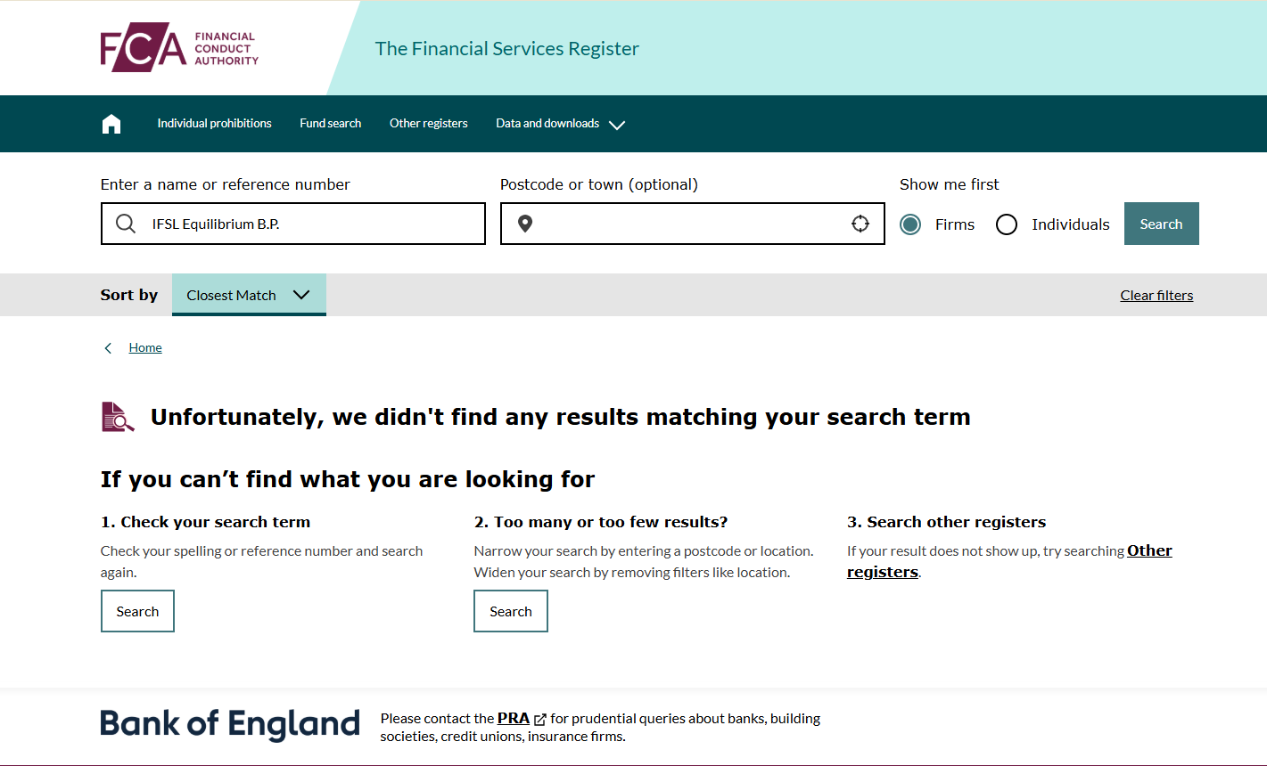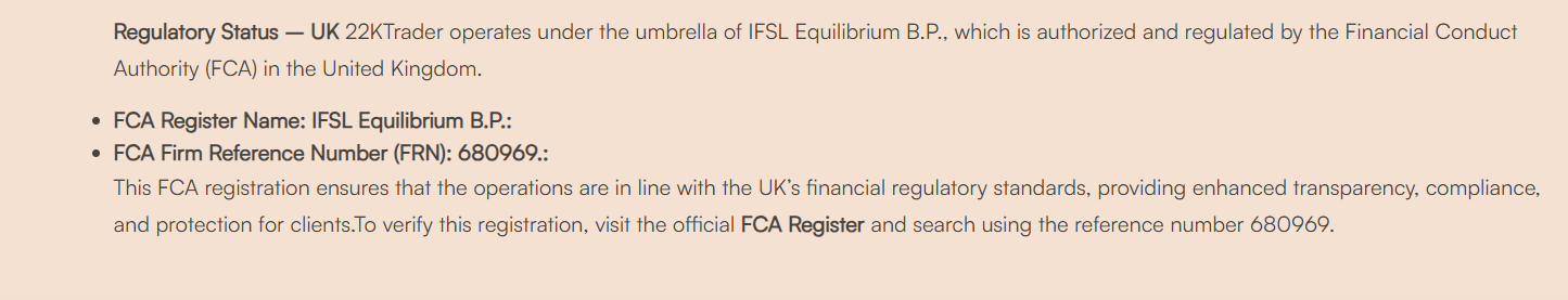 22K Trader states that it operates under IFSL Equilibrium B.P. and is regulated by the UK’s Financial Conduct Authority (FCA) with reference number 680969. However, our thorough search of the FCA’s official register, using both the firm name and the stated reference number, returned no matching records.