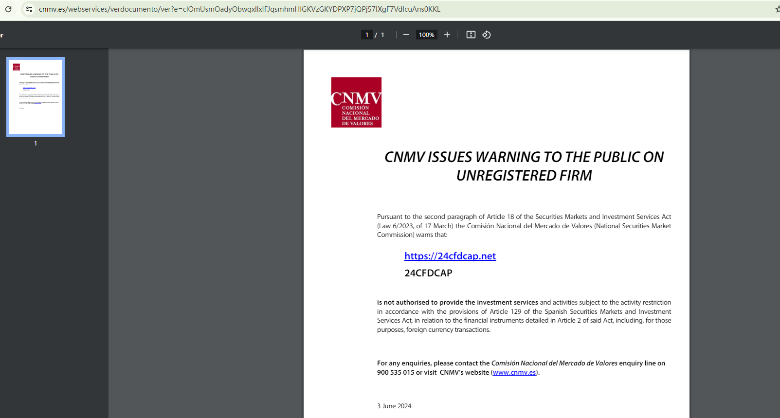 On June 3, 2024, the Comisión Nacional del Mercado de Valores (CNMV) added 24 CFDCAP to its warning list for providing investment services without authorization. https://www.cnmv.es/portal/ResultadoBusqueda.aspx?tipo=1&nombre=24cfdcap