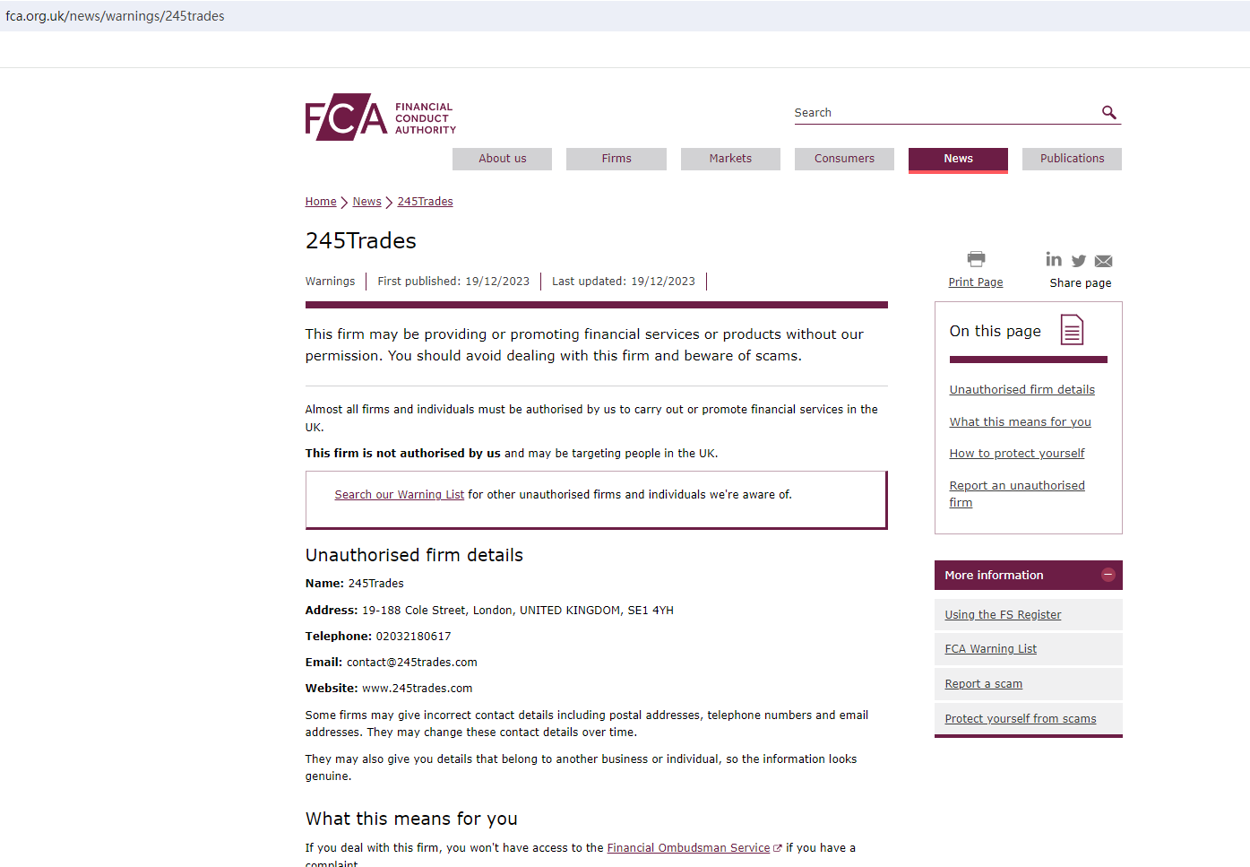 On 19 December 2023, the United Kingdom Financial Conduct Authority (UK FCA) issued a warning that 245Trades was providing financial services or products in the UK without authorisation. You may visit: https://www.fca.org.uk/news/warnings/245trades