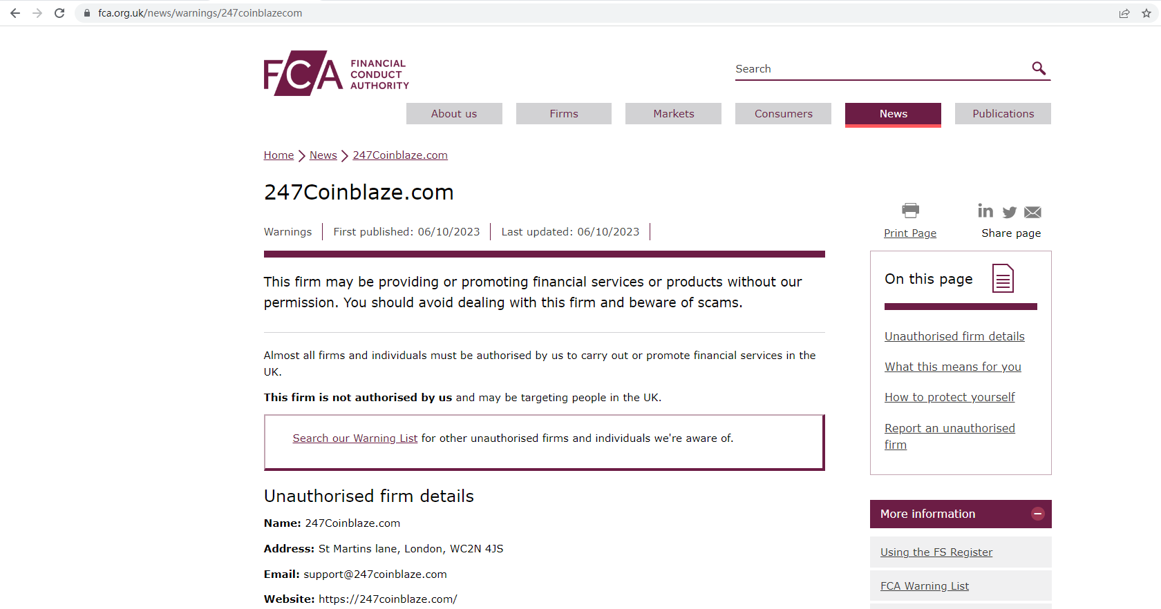 On 6 October 2023, the United Kingdom Financial Conduct Authority (UK FCA) issued a warning that 247Coinblaze.com was providing financial services or products in the UK without authorisation. You may visit: https://www.fca.org.uk/news/warnings/247coinblazecom