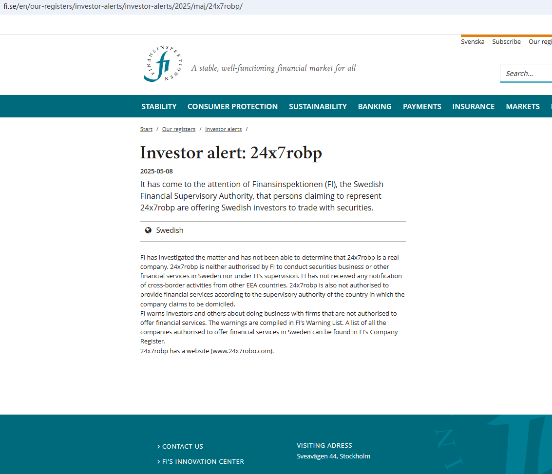 On May 8, 2025, the Finansinspektionen (FI) issued a warning against 24x7robp, suspecting that it is not a real company. https://www.fi.se/en/our-registers/investor-alerts/investor-alerts/2025/maj/24x7robp/