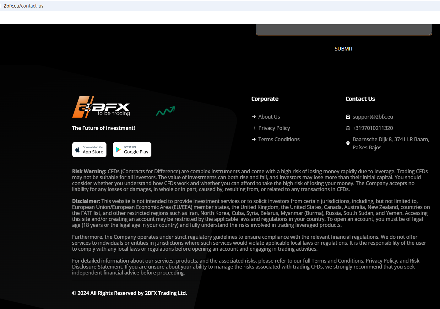 It claims to be a reliable company, but does not publish any valid regulatory information on its website. Its address is in the Netherlands, but we did not find any matching information in the Dutch Authority for the Financial Markets (AFM). In addition, the National Securities Market Commission (CNMV) issued a warning against 2B FX, believing this company might be providing financial services or products without proper authorization.