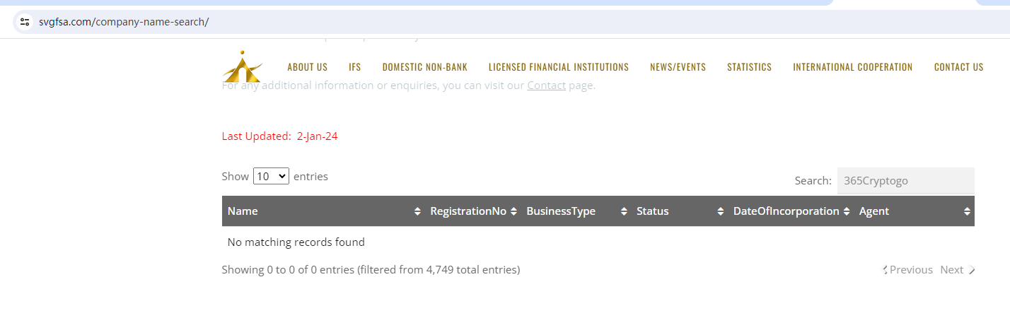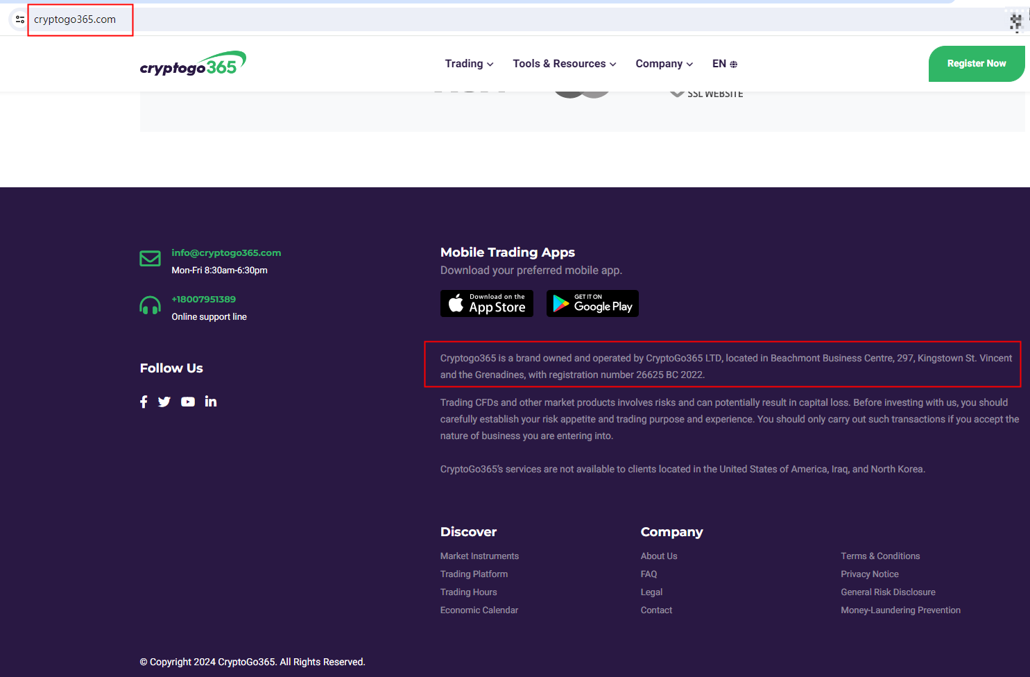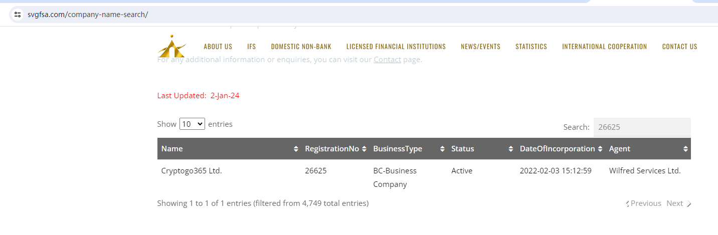 365 FX MARKETS claims to be operated by 365Cryptogo Ltd, which is registered in Financial Services Authority (FSA) of Saint Vincent and the Grenadines under registered number 26625 BC 2022.