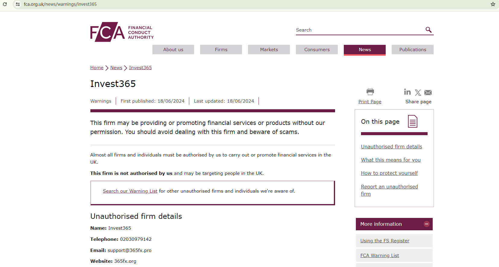 On June 18, 2024, the Financial Conduct Authority (FCA) issued a warning against 365FX (Invest365), believing this company might be providing financial services or products without proper authorization in the UK. https://www.fca.org.uk/news/warnings/invest365