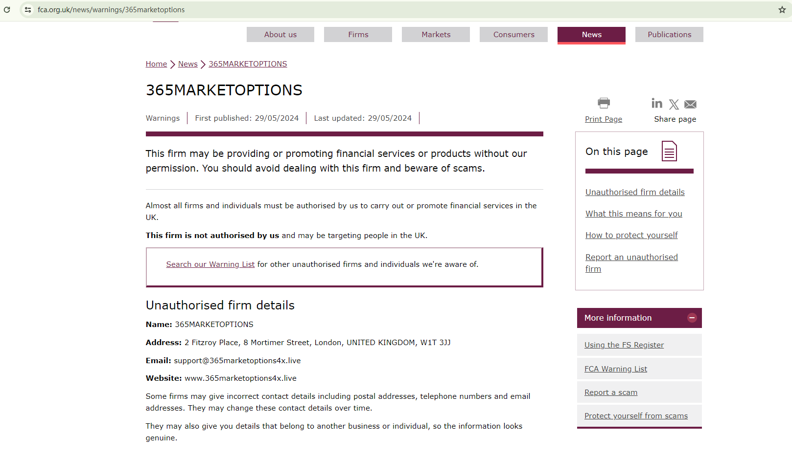 On May 29, 2024, the Financial Conduct Authority (FCA) issued a warning against 365MARKETOPTIONS, believing this company might be providing financial services or products without proper authorization in the UK. https://www.fca.org.uk/news/warnings/365marketoptions