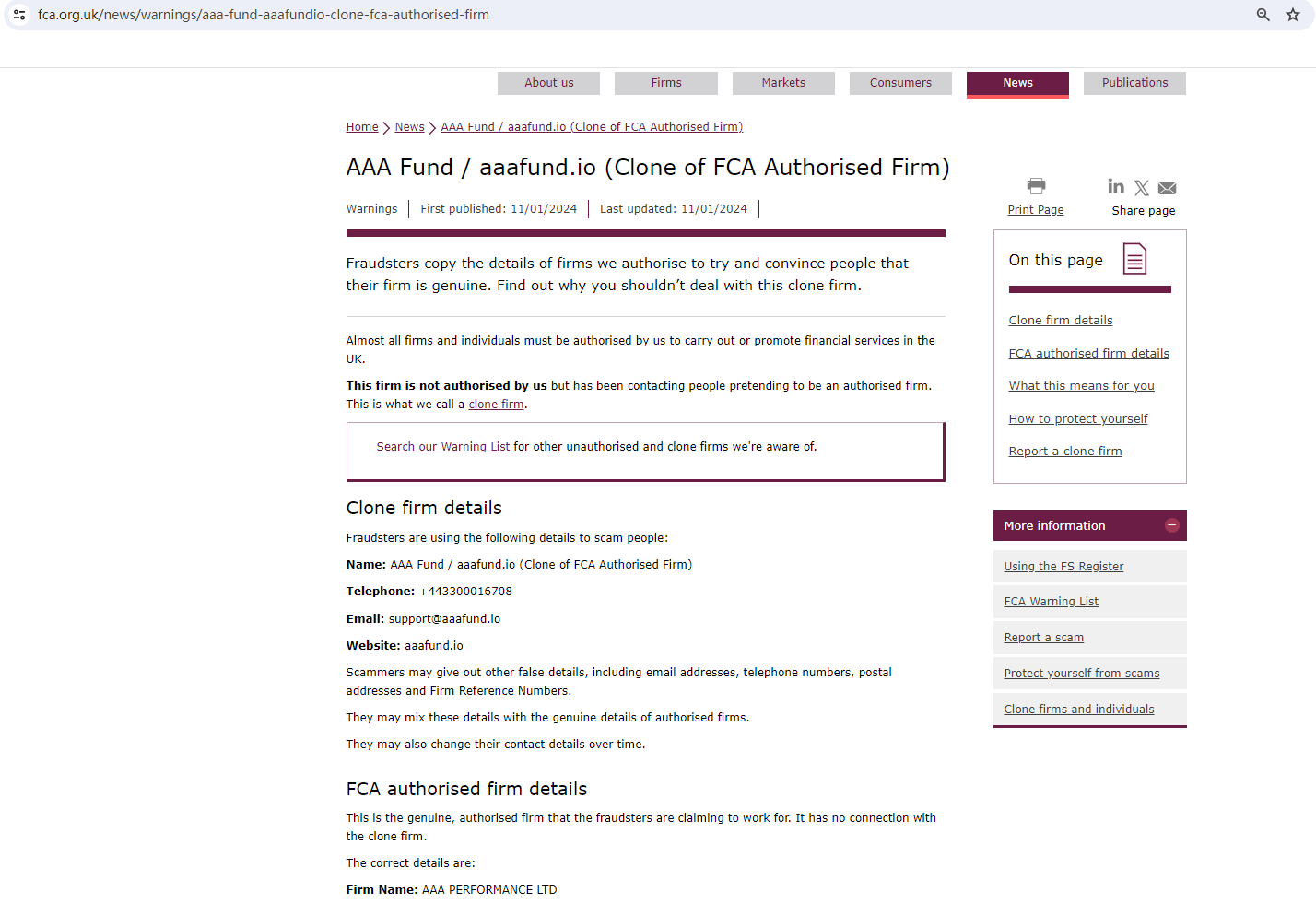 The Financial Conduct Authority (FCA) issued a warning against AAA Fund, identifying this company as a clone of an FCA-authorized firm.