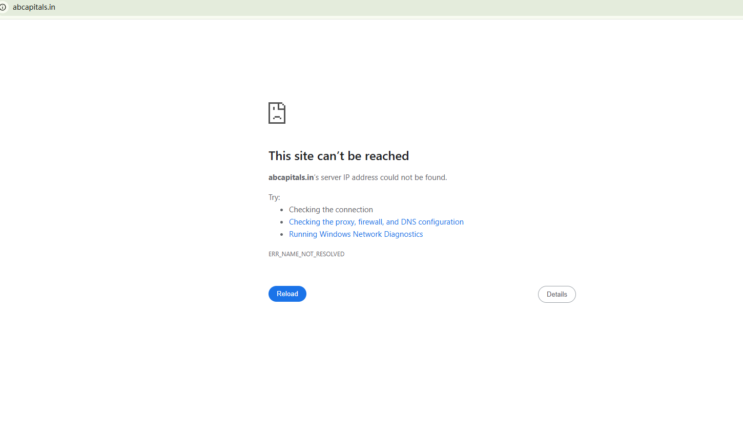 BrokersView found that the domain "https://abcapitals.in/" is currently inaccessible. This is widely regarded as a significant red flag, as the suspension of a broker's website often points to underlying regulatory or operational issues.