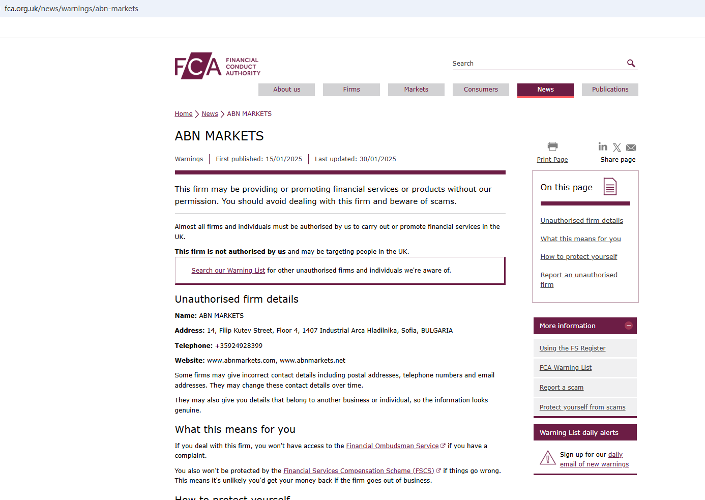 On January 15, 2025, the Financial Conduct Authority (FCA) issued a warning against ABN MARKETS, believing this company might be providing financial services or products without proper authorization in the UK. https://www.fca.org.uk/news/warnings/abn-markets