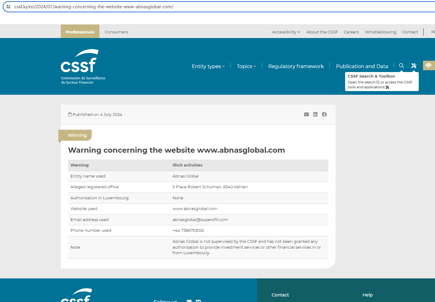 On 4 July, 2024, Commission de Surveillance du Secteur Financier (CSSF) issues a warning about the fraudulent activities carried out by the entity Abnas Global. https://www.cssf.lu/en/2024/07/warning-concerning-the-website-www-abnasglobal-com/