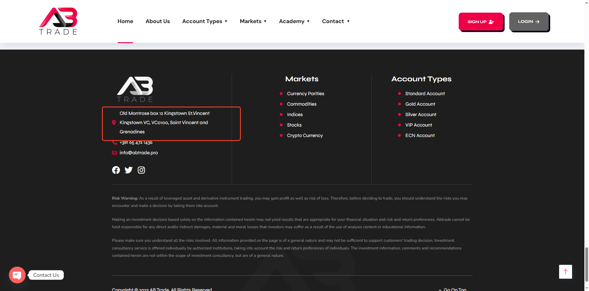 ABTrade’s website does not display any regulatory information, and crucially, it fails to disclose the legal entity name behind the operation. While the site lists an address in Saint Vincent, the absence of a registered company name makes it impossible to verify whether it is even registered with the Financial Services Authority (FSA) of Saint Vincent and the Grenadines.