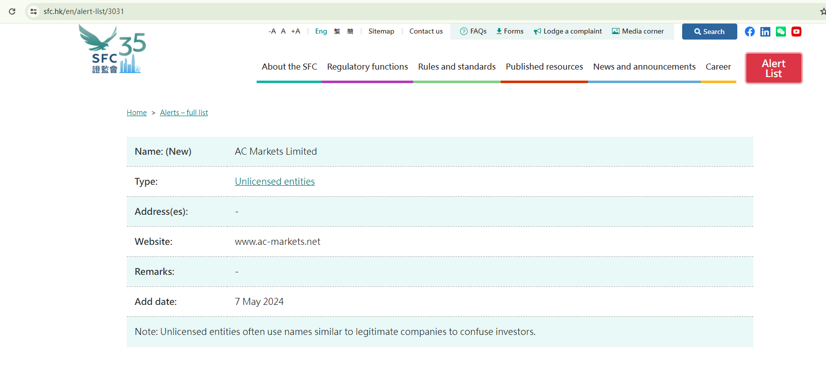On 7 May, 2024, the Hong Kong Securities and Futures Commission (HK SFC) issued a warning about AC Markets Limited, identifying it as an unlicensed entity. https://www.sfc.hk/en/alert-list/3031