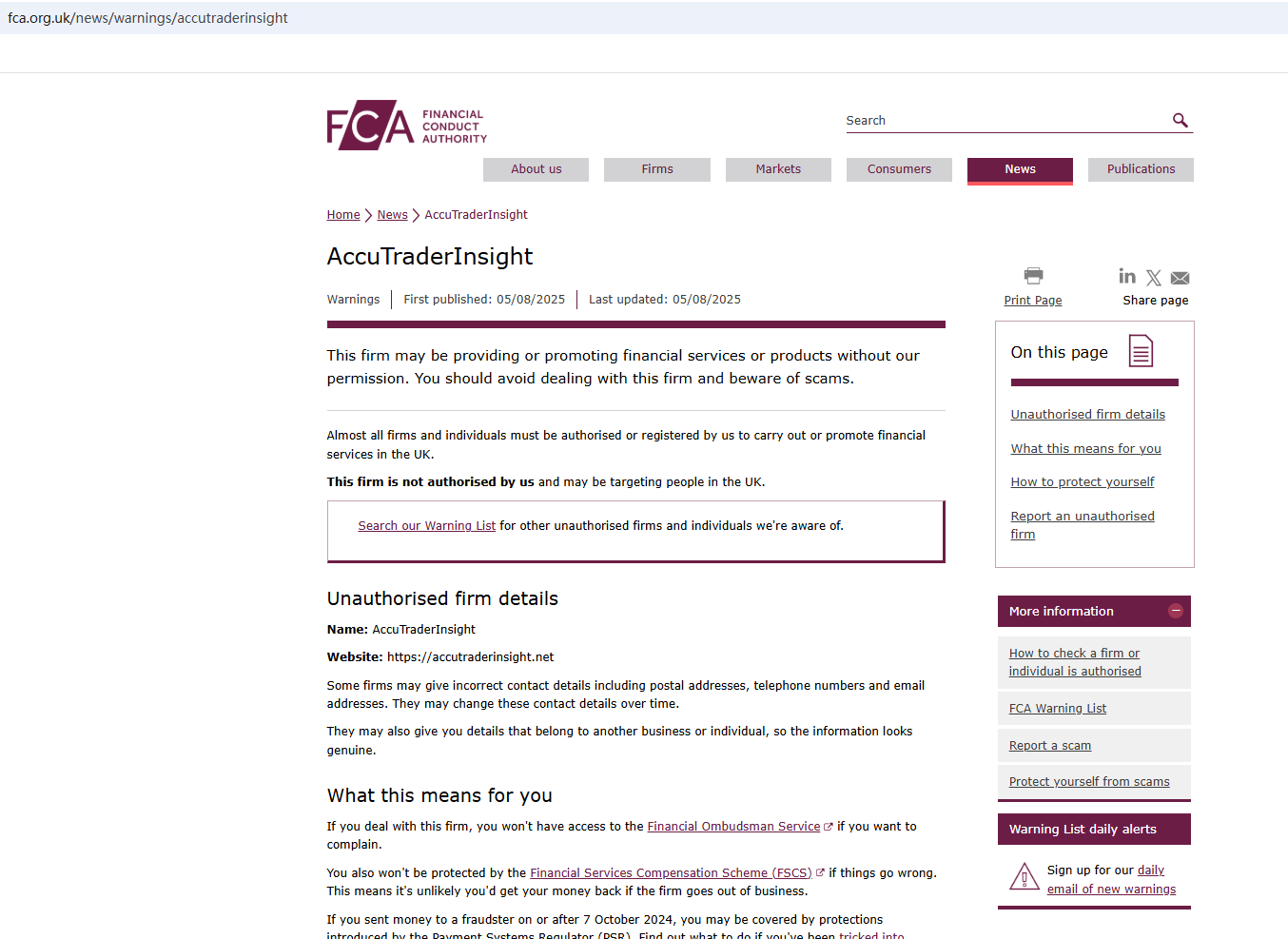On Aug 5, 2025, the Financial Conduct Authority (FCA) issued a warning against AccuTraderInsight, believing this company might be providing financial services or products without proper authorization in the UK. https://www.fca.org.uk/news/warnings/accutraderinsight