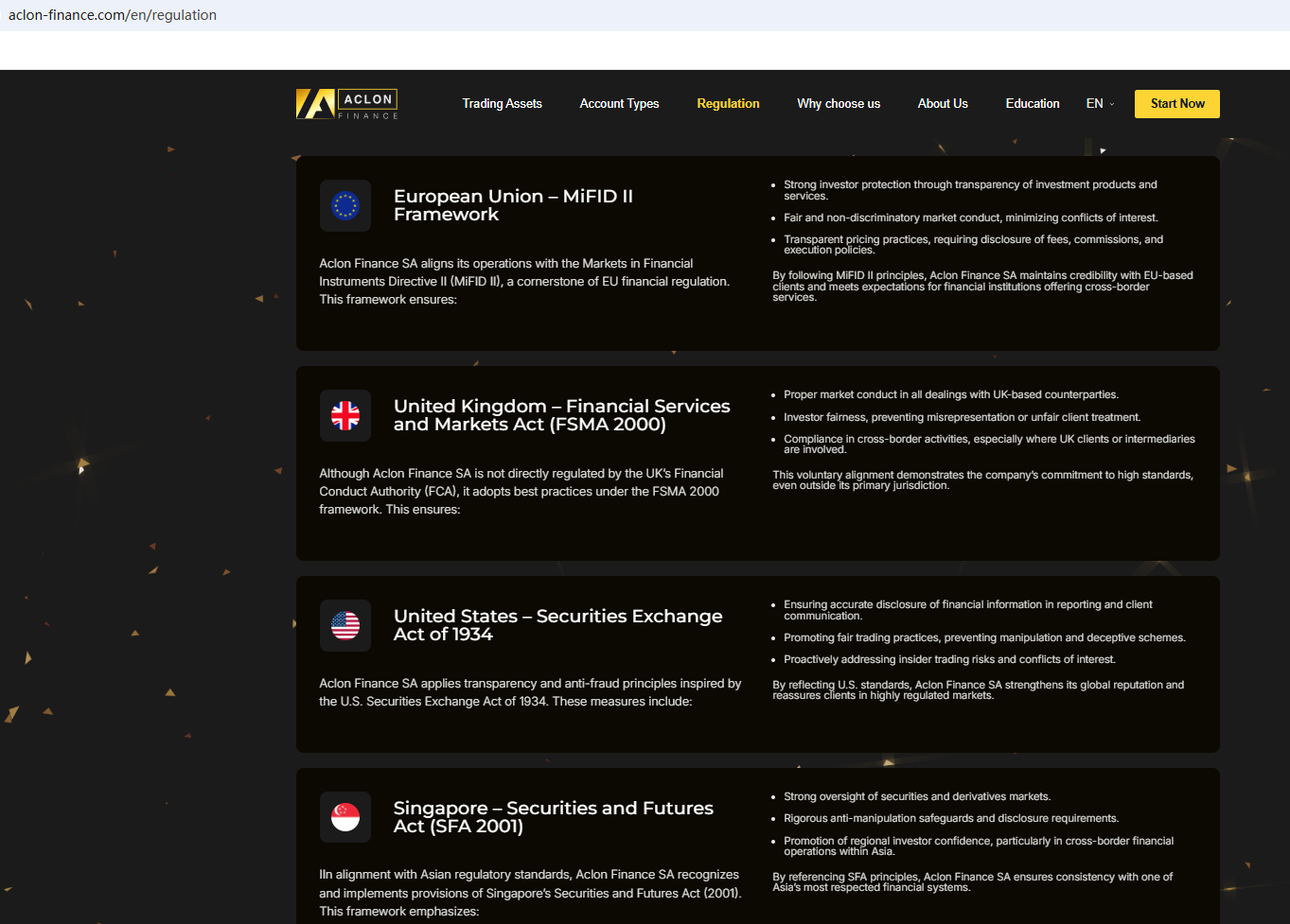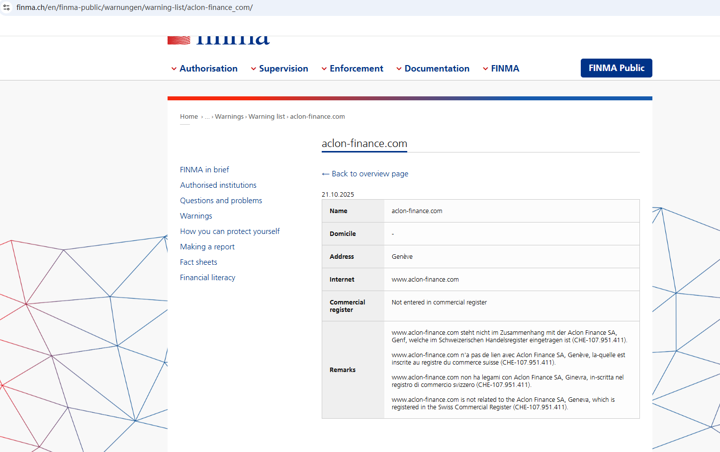 On Oct 21, 2025, the Swiss Financial Market Supervisory Authority (FINMA) issued a warning against Aclon Finance SA, stating that this broker is not entered in its commercial register. https://www.finma.ch/en/finma-public/warnungen/warning-list/aclon-finance_com/