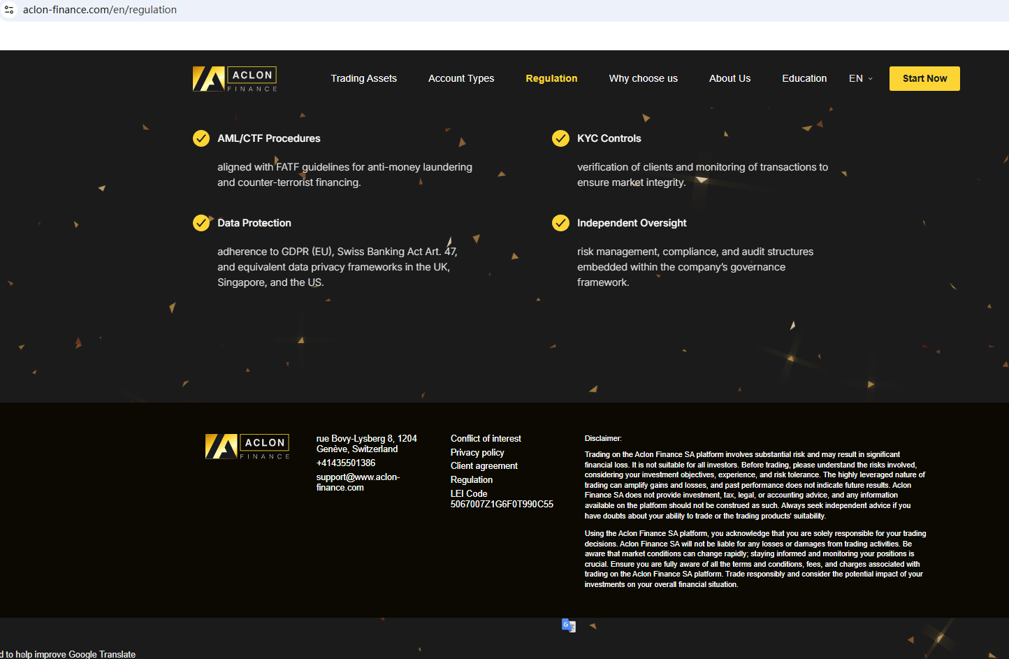 According to its website, it repeatedly claims to be subject to multiple regulations, and while it cites some seemingly compliant regulatory certificates, a closer look reveals that some of the regulatory information displayed on its website does not demonstrate the authority to regulate foreign exchange. It states its office address is in Switzerland, and ironically, we found that the Swiss Financial Market Supervisory Authority (FINMA) issued a warning against Aclon Finance SA, stating that this broker is not entered in its commercial register.