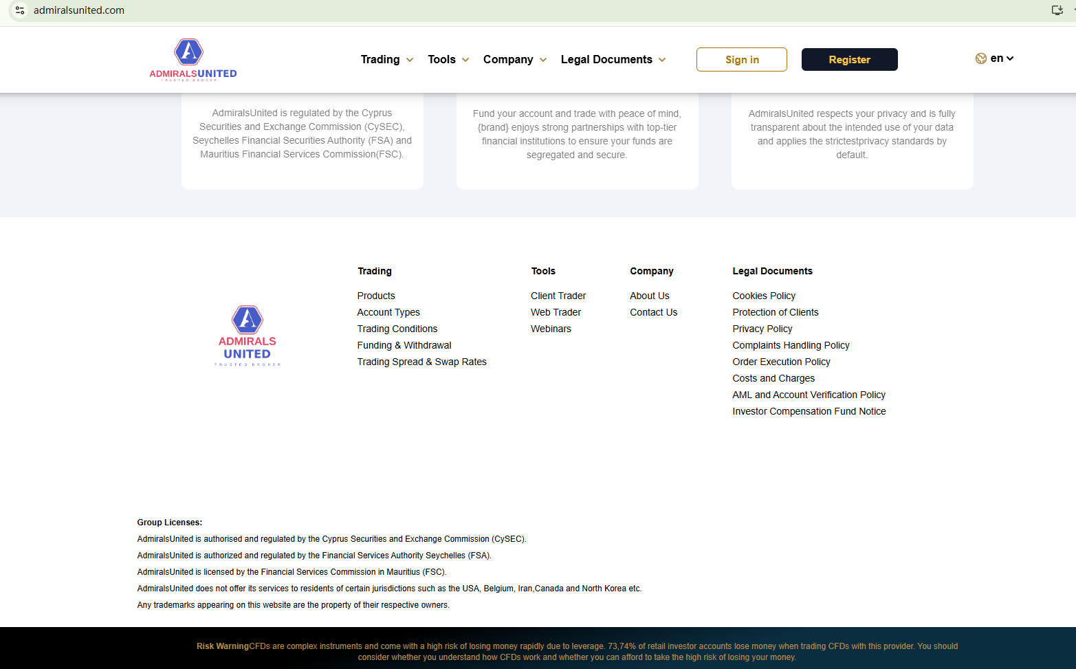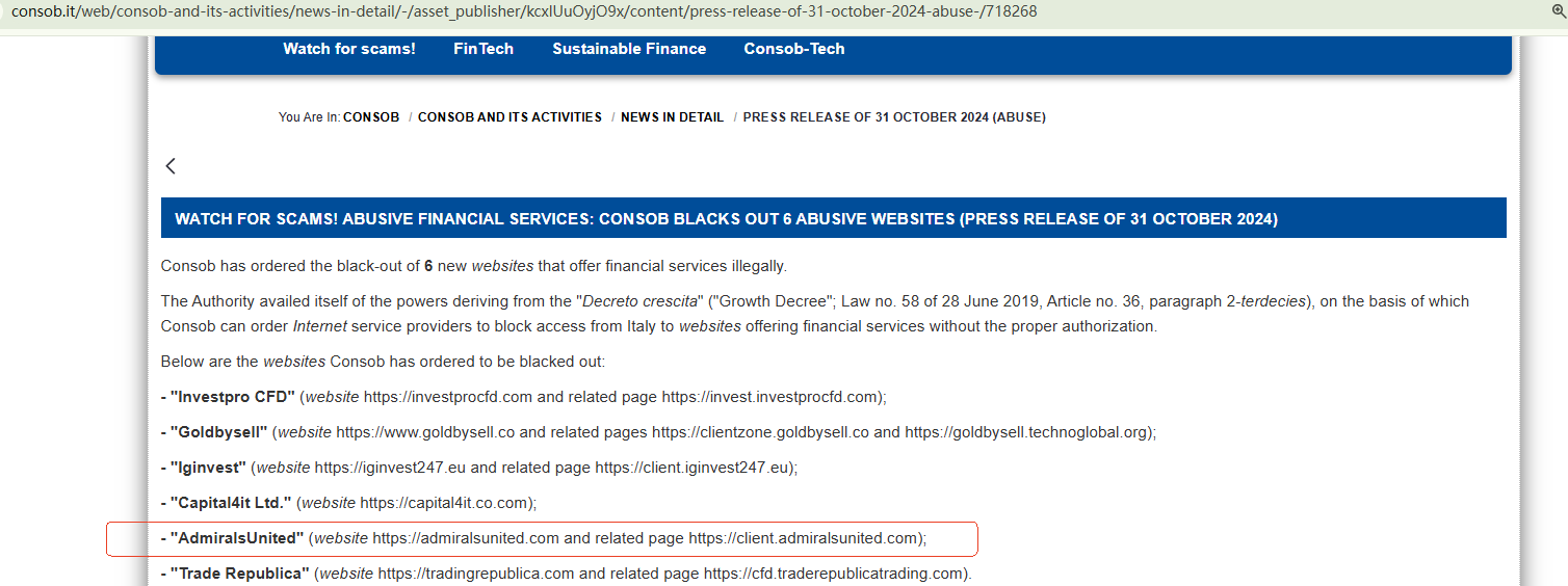 On October 31, 2024, the Italian Companies and Exchange Commission (CONSOB) ordered AdmiralsUnited's website to be blacked out since it offers financial services illegally in Italy. https://www.consob.it/web/consob-and-its-activities/news-in-detail/-/asset_publisher/kcxlUuOyjO9x/content/press-release-of-31-october-2024-abuse-/718268