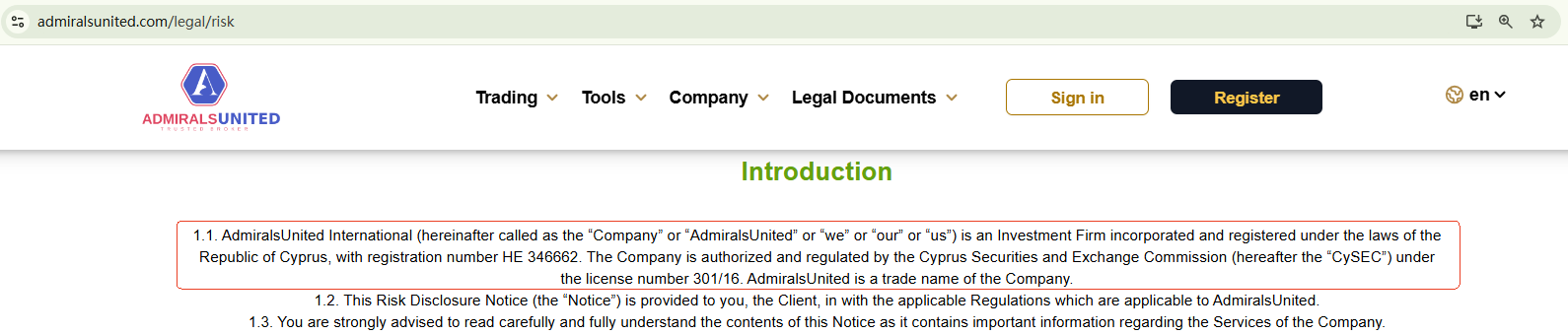In essence, AdmiralsUnited is not regulated by any governing body. Entrusting it with investors' funds is highly risky, as there are no legal protections in place to safeguard the funds.