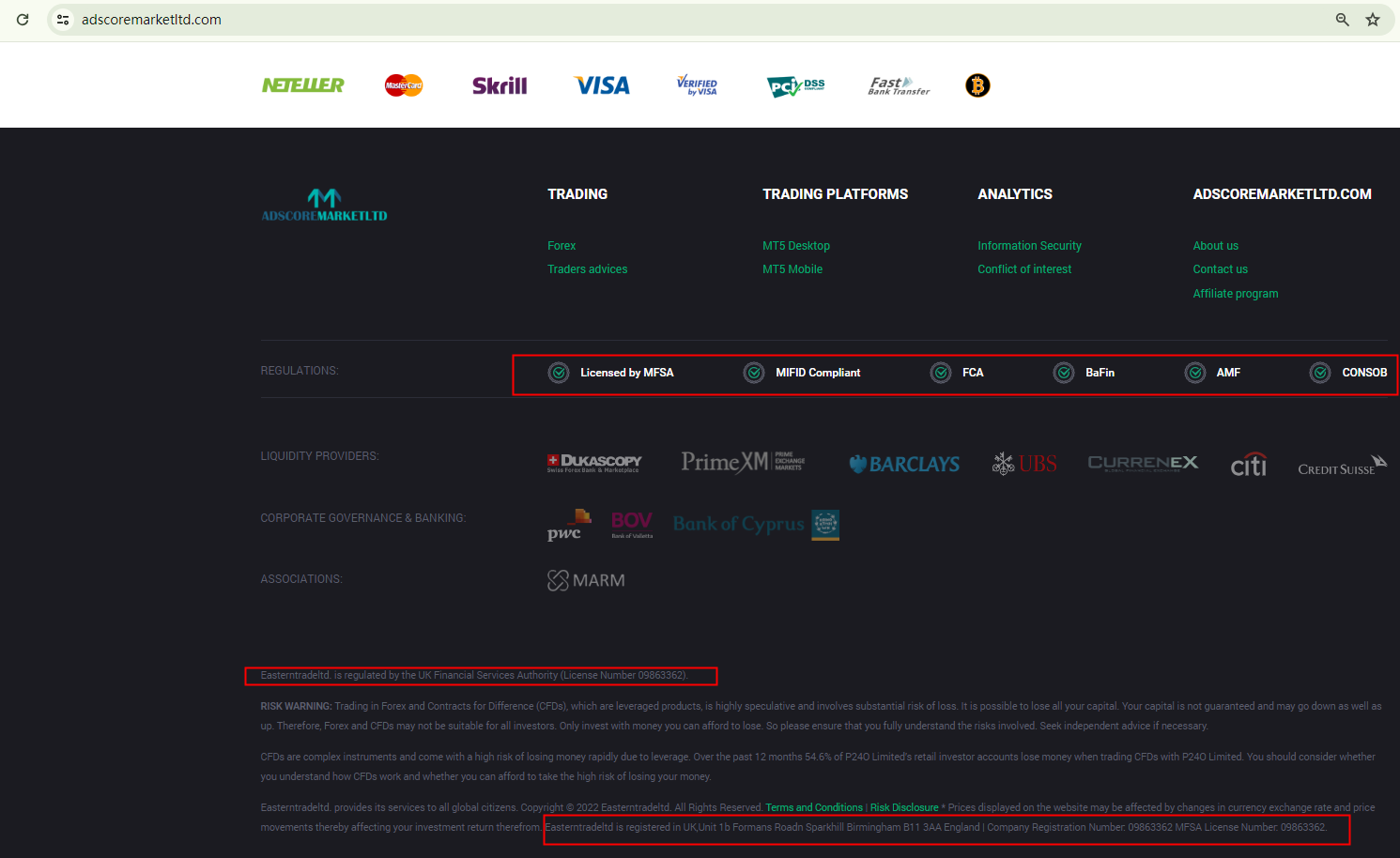Adscoremarketltd incorrectly identifies the MFSA as being located in Cyprus, when in fact this financial regulator is based in Malta. Furthermore, at the bottom of its homepage, where it purports to display its regulatory status and disclaimers, it refers to itself by a different name, Easterntradeltd. This inconsistency strongly suggests that it is a fraudulent investment website and its claims should not be trusted. It also mentions P24O Limited, a notorious company (also known as P240 Ltd) that has been frequently flagged by the Malta Financial Services Authority (MFSA) and other major financial regulators.