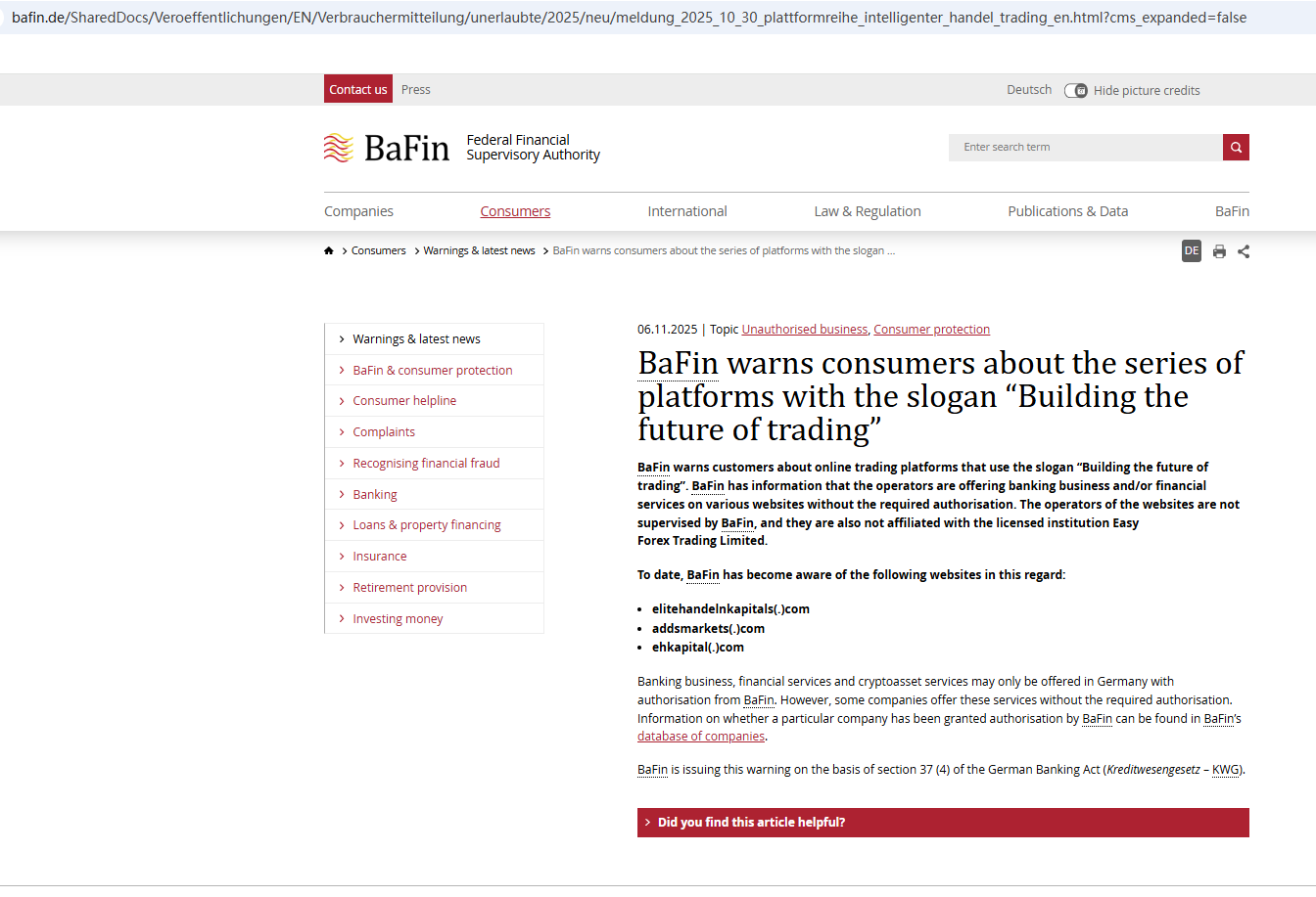 According to its website, it claims to be registered in Cyprus. However, our investigation revealed that elitehandelnkapitals.com is not among its registered domains. ADSS Markets has stolen information from a legitimate company in an attempt to impersonate it. In addition, the Federal Financial Supervisory Authority (BaFin) issued a warning against ADSS Markets for the lack of the required authorization.