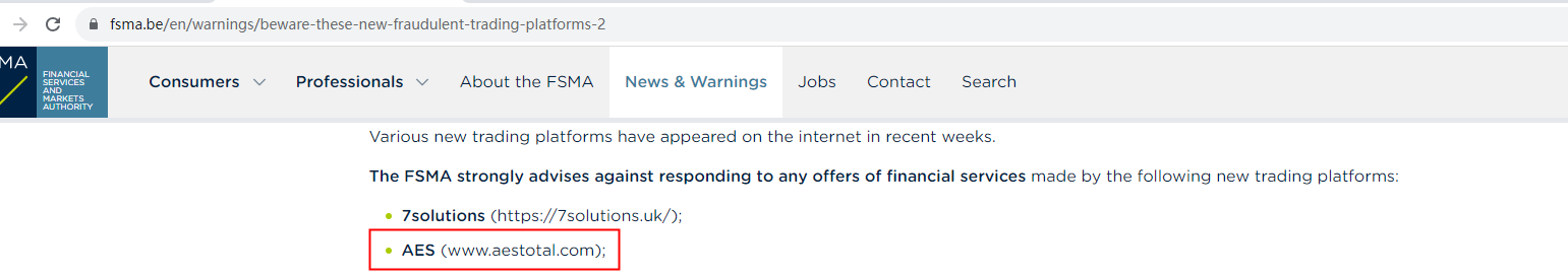 On 30 November 2023, the Financial Services and Markets Authority (FSMA) issued a warning that AES was providing financial services or products without authorisation. You may visit: https://www.fsma.be/en/warnings/beware-these-new-fraudulent-trading-platforms-2