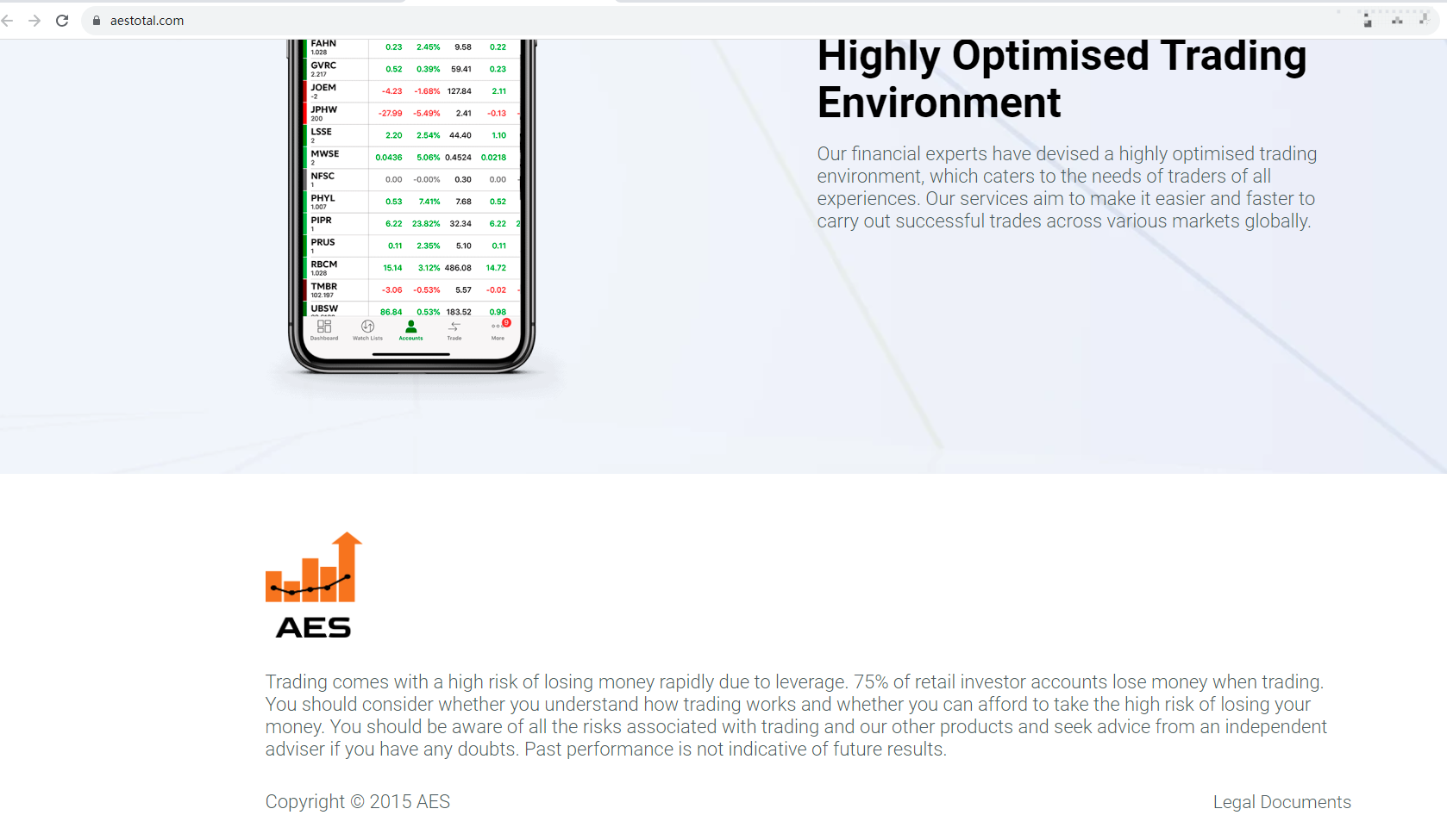 AES claims to be a reliable company without presenting any information about its regulation or contact. The lack of such important information may be a distinct signal of an unlicensed broker, as regulated companies always present their accreditations and licenses in a prominent position. It is a red flag.