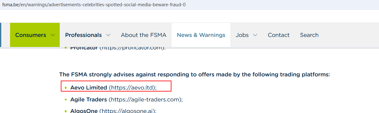 On March 19, 2025, the Financial Services and Markets Authority (FSMA) issued a warning about Aevo Limited for the lack of the required authorization. https://www.fsma.be/en/warnings/advertisements-celebrities-spotted-social-media-beware-fraud-0
