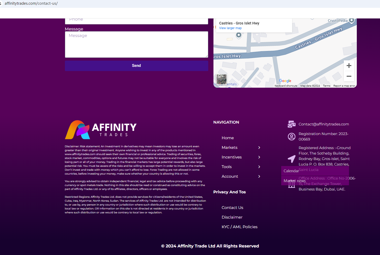 Affinity Trades claims to be registered in St. Lucia, promoting this registration as proof of its legitimacy. However, forex trading activities are not licensed in St. Lucia. In addition, it is located in Dubai. Upon investigation, no matching information was found in the Securities and Commodities Authority (SCA), DuBai Financial Services Authority (DFSA), and Central Bank of U.A.E. (CBUAE).