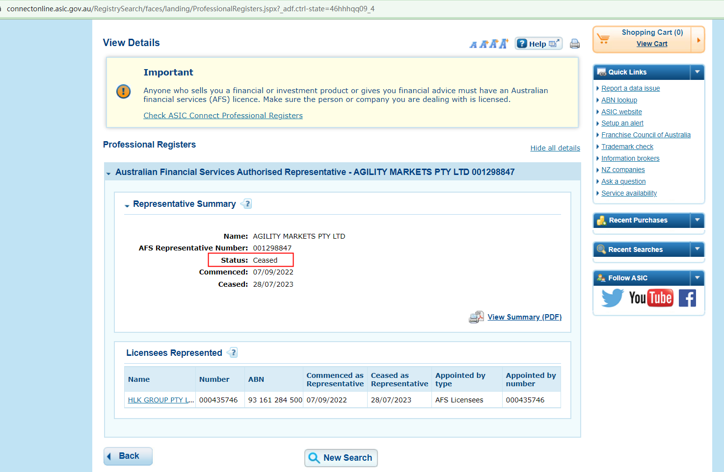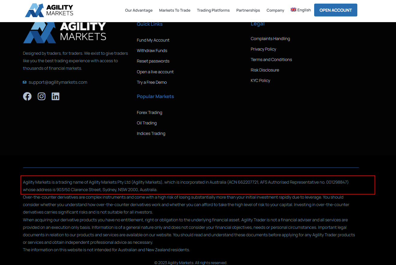 The Agility Markets platform is promoted as the trading name of Agility Markets Pty Ltd. It is located in Australia and is regulated by Australian Securities & Investments Commission (ASIC) (AR 001298847). It provides investment and trading services in financial derivatives such as foreign exchange, indices, commodities, precious metals, and crude oil. After inquiry, the company name corresponding to Australian ASIC AR 001298847 is AGILITY MARKETS PTY LTD, which is an authorized representative of AR and has no registered website address. The company's license was canceled on May 28, 2023, and is obviously no longer subject to supervision.