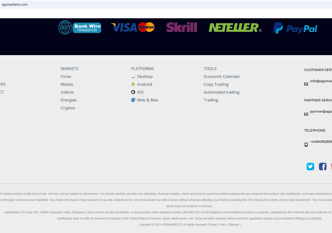AgsMarkets claims on its website that it is regulated by the Financial Services Authority of St. Vincent and the Grenadines (SVG FSA). Upon investigation, we found that its registration with the SVG FSA has been cancelled. All signs indicate that AgsMarkets has huge risks. Investors should be aware of the relevant developments and operate with caution.