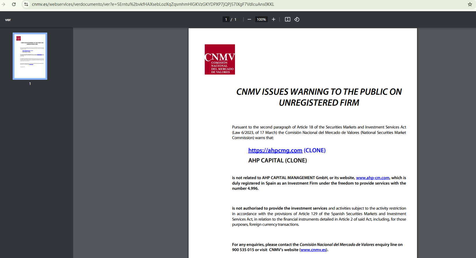 On September 23, 2024, the Comisión Nacional del Mercado de Valores (CNMV) flagged ahpcmg.com as an imposter site, stating that the site is not related to the genuine firm AHP CAPITAL MANAGEMENT GmbH. https://www.cnmv.es/portal/ResultadoBusqueda.aspx?tipo=1&nombre=ahpcmg