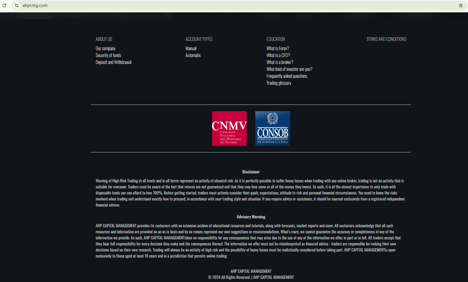 While the site attempts to create the impression of being legitimate and genuine by displaying the logos of regulators and claiming that the company behind it is AHP CAPITAL MANAGEMENT, this is all a lie. The Comisión Nacional del Mercado de Valores (CNMV) has issued a warning about the site ahpcmg.com, flagging it as an imposter and stating that it is not associated with AHP CAPITAL MANAGEMENT GmbH.