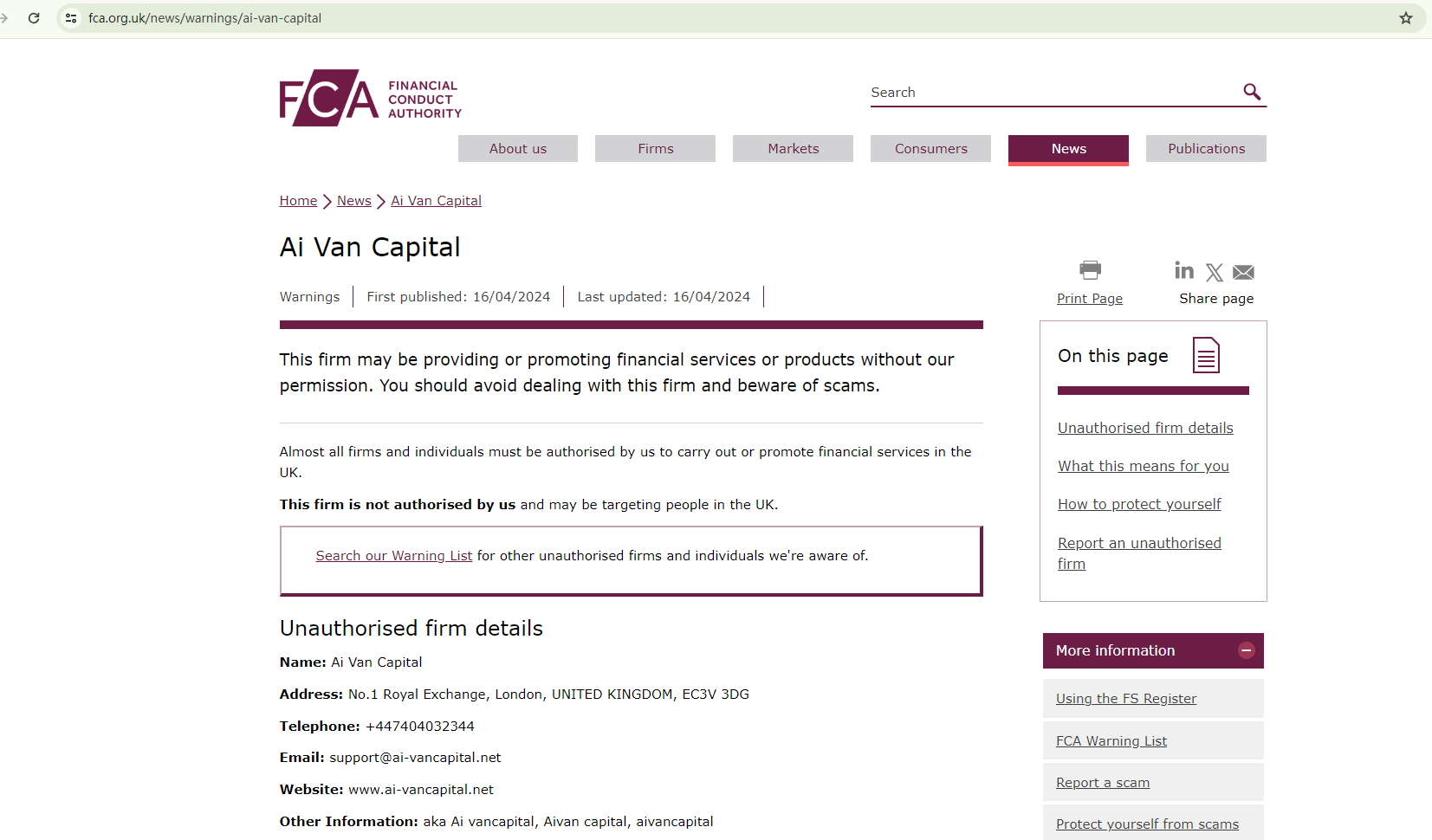 On April 16, 2024, the Financial Conduct Authority (FCA) issued a warning against Ai Van Capital, believing this company might be providing financial services or products without proper authorization in the UK. https://www.fca.org.uk/news/warnings/ai-van-capital
