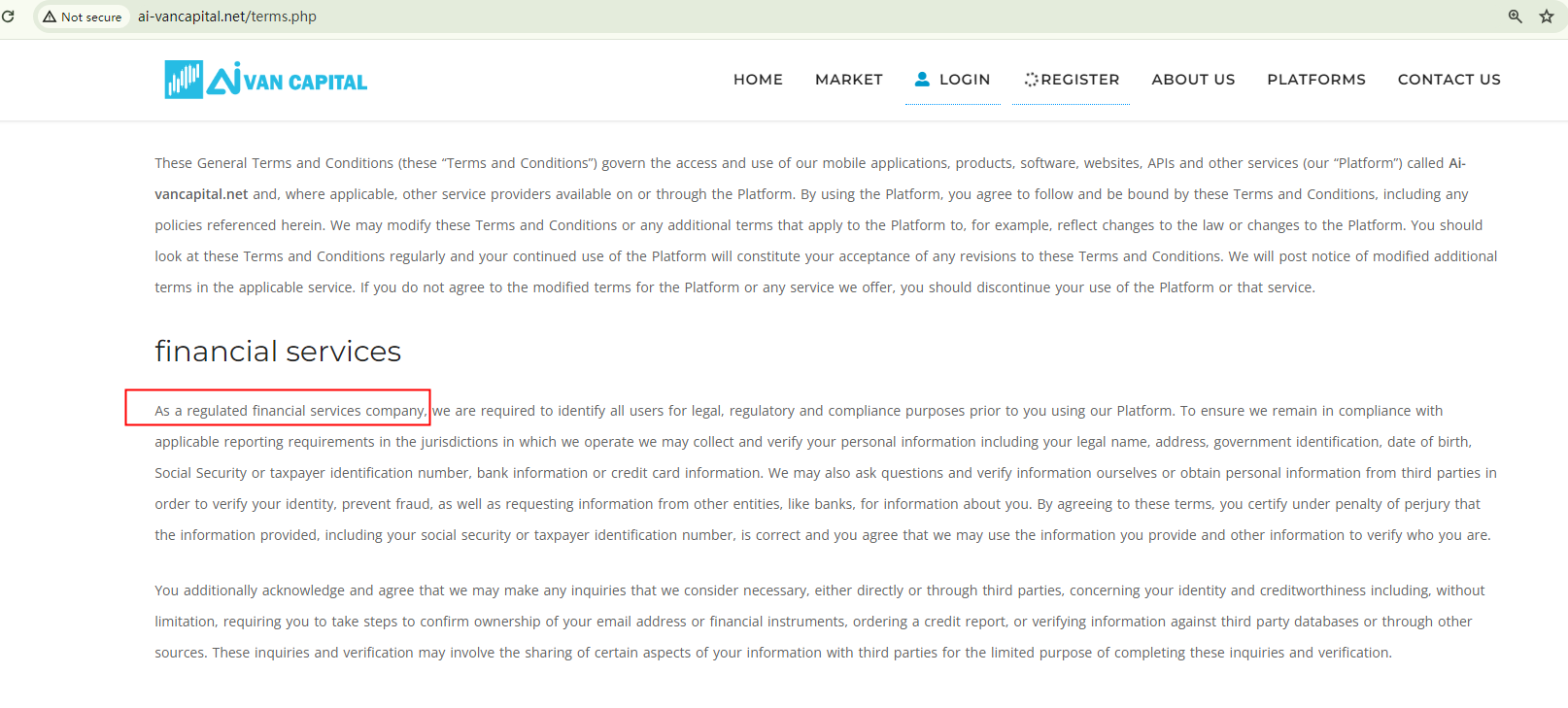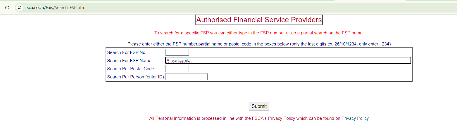 Ai Van Capital asserts that it is a regulated broker, yet it fails to provide specific details to back up such claims. It mentions the Financial Sector Conduct Authority (FSCA), prompting us to conduct a search on the FSCA register. However, our search yielded no matching records, which raises a red flag.