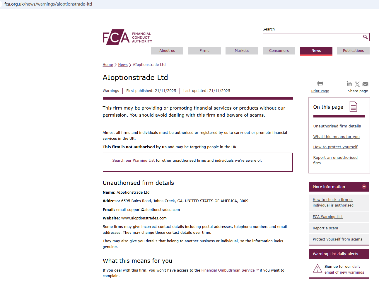 On November 21, 2025, the Financial Conduct Authority (FCA) issued a warning regarding AIoptionstrade Ltd, suspecting that this company may be offering financial services or products without the necessary authorization. https://www.fca.org.uk/news/warnings/aioptionstrade-ltd