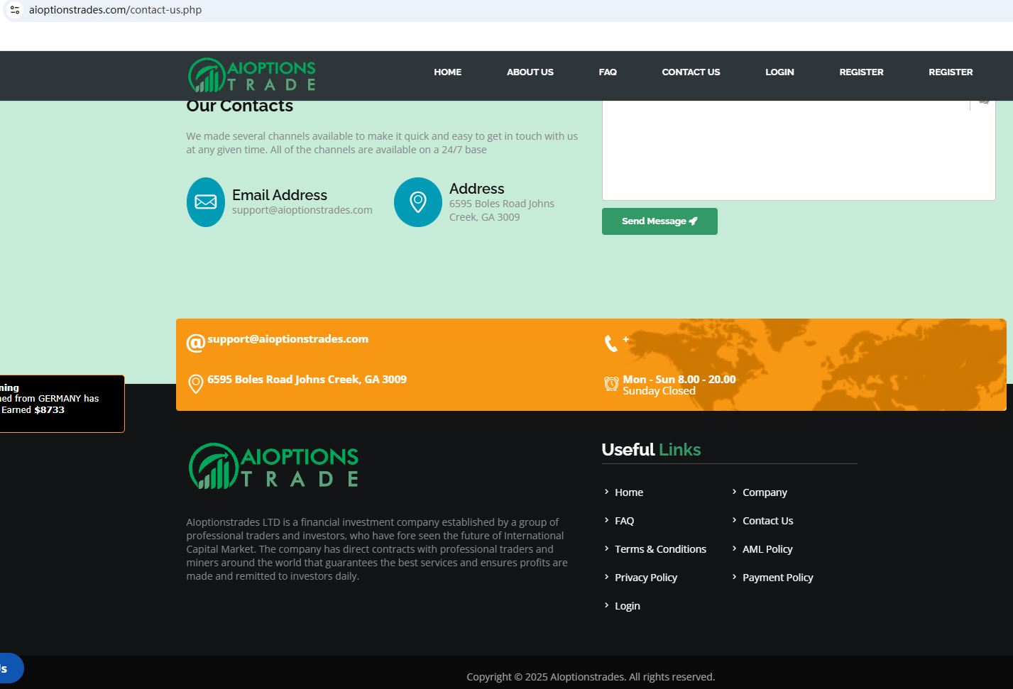 According to its website, the company claims to have been registered in the United States in 2016. However, our investigation revealed that its domain was created only in 2024, and no matching information was found in the National Futures Association (NFA). Clearly, the information presented on its website is inconsistent with the facts. In addition, the Financial Conduct Authority (FCA) issued a warning regarding AIoptionstrade Ltd, suspecting that this company may be offering financial services or products without the necessary authorization.
