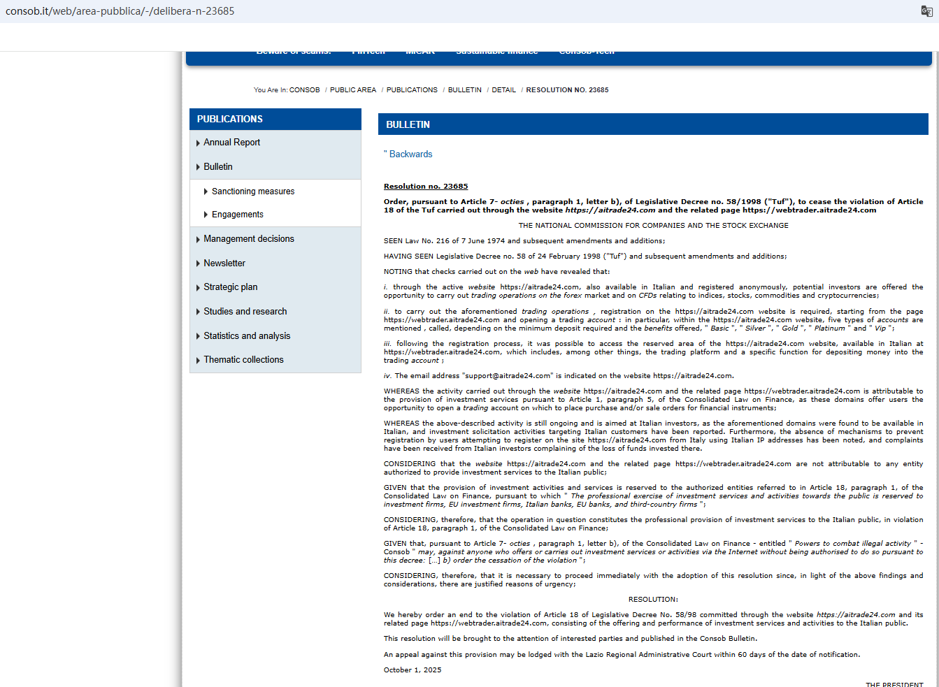 On Oct 1, 2025, the Italian Companies and Exchange Commission (CONSOB) ordered Airtrade24 to be blacked out since it offers financial services illegally in Italy. https://www.consob.it/web/area-pubblica/-/delibera-n-23685