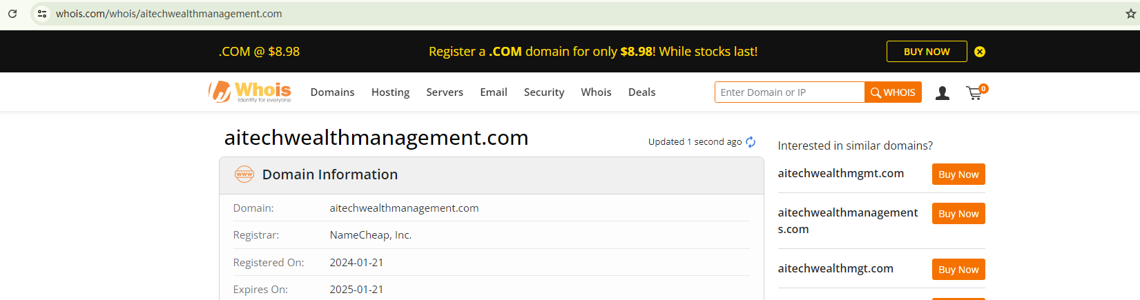 Despite its claims of extensive experience, AITech Wealth Management's website was only registered in January 2024. Investors should exercise caution with platforms that claim a lengthy history despite being newly established.