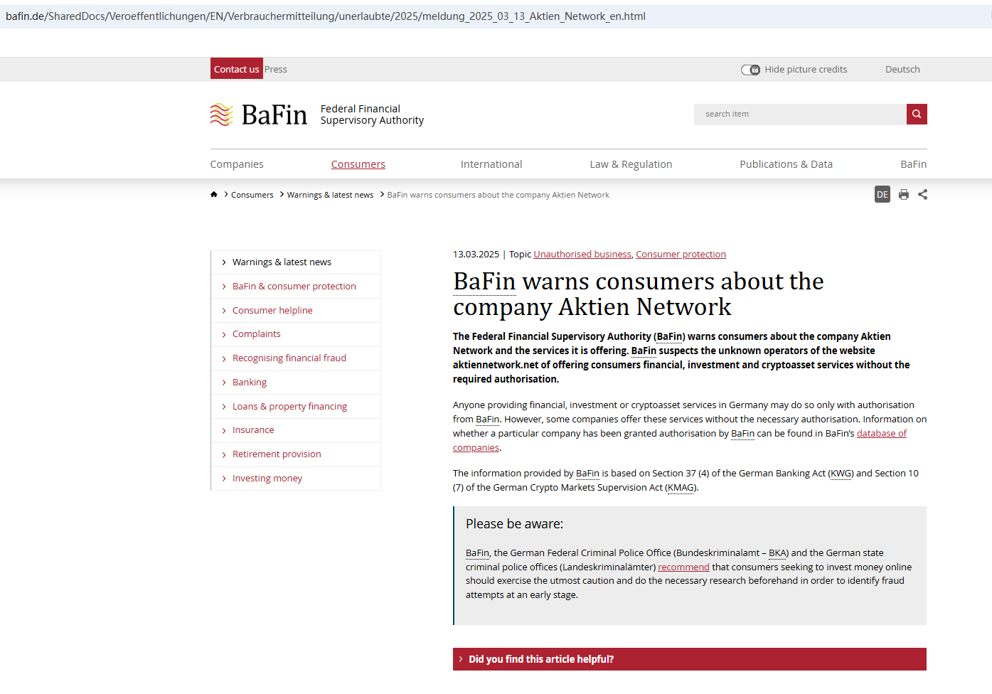 On March 13, 2025, the Federal Financial Supervisory Authority (BaFin) issued a warning against Aktien Network, believing this company might be providing financial services or products without proper authorization. https://www.bafin.de/SharedDocs/Veroeffentlichungen/EN/Verbrauchermitteilung/unerlaubte/2025/meldung_2025_03_13_Aktien_Network_en.html