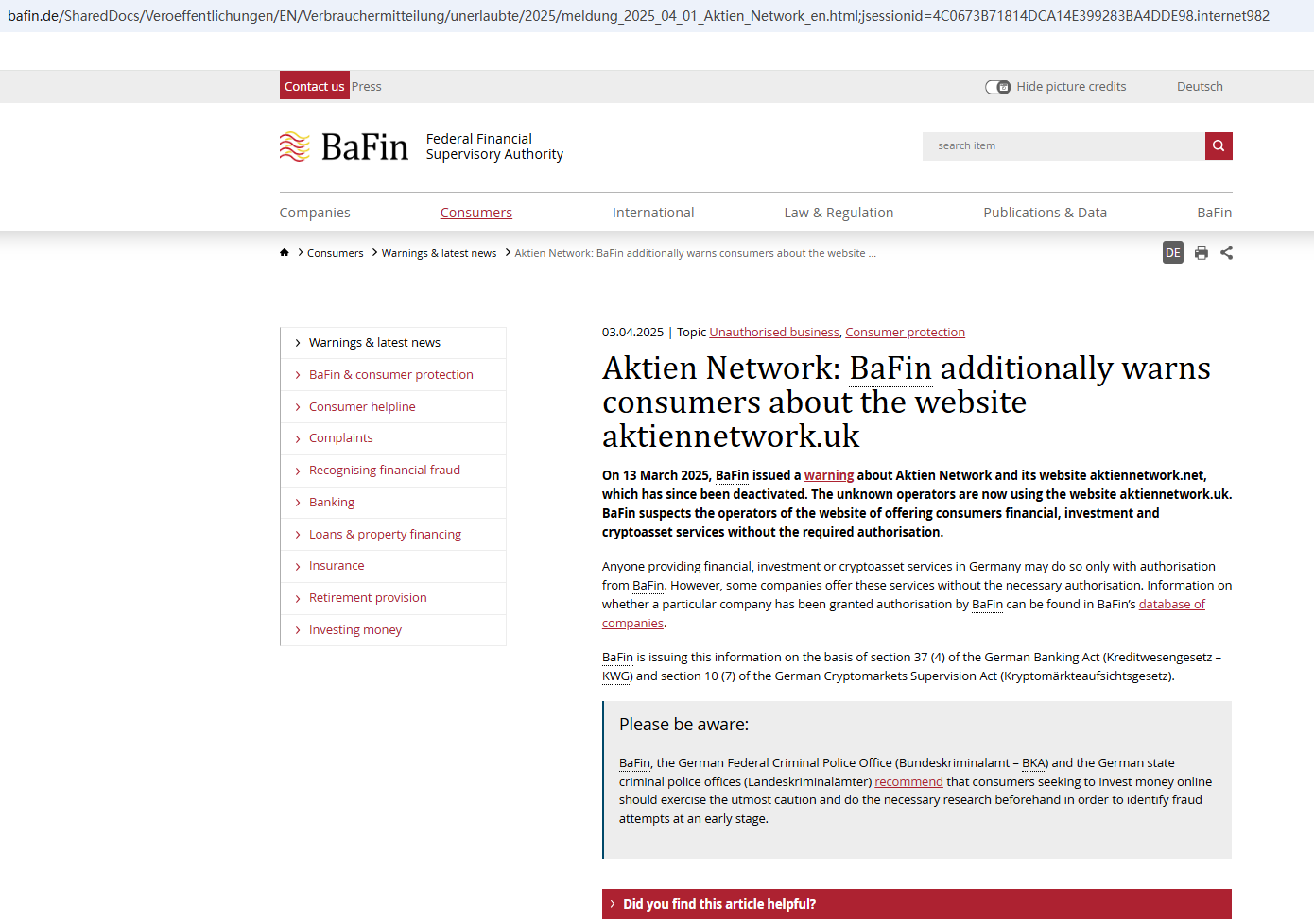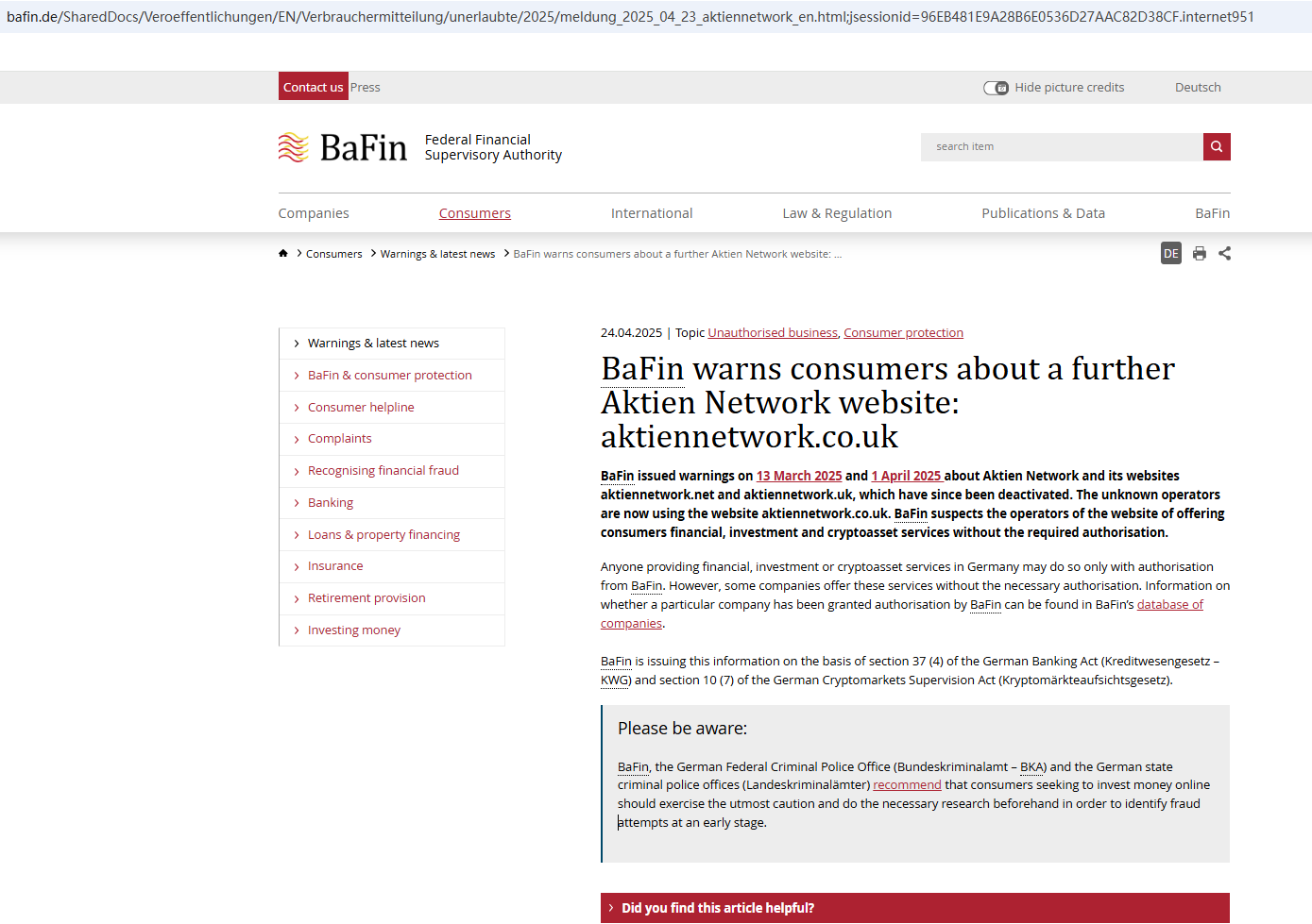 Aktien Network’s old domains are no longer valid, so it created a new domain (aktiennetwork.co.uk) to confuse investors. As a result, BaFin has updated its warning against Aktien Network, warning the public to stay away from this unauthorized company. https://www.bafin.de/SharedDocs/Veroeffentlichungen/EN/Verbrauchermitteilung/unerlaubte/2025/meldung_2025_04_23_aktiennetwork_en.html;jsessionid=96EB481E9A28B6E0536D27AAC82D38CF.internet951