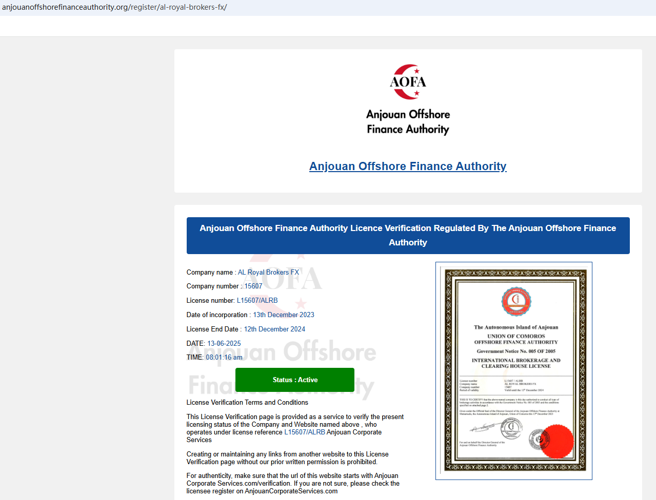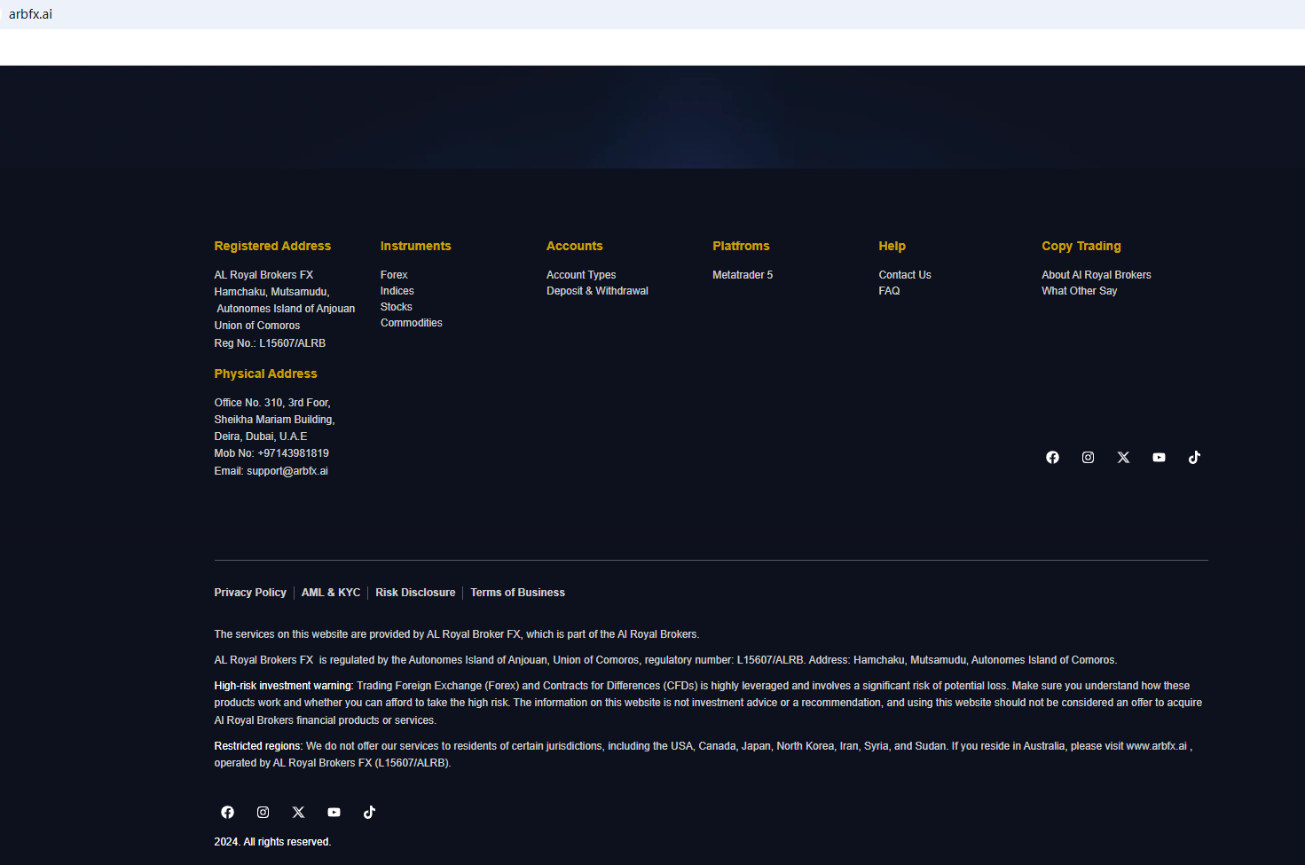 In essence, AL Royal Brokers FX is not regulated by any governing body. Entrusting it with investors' funds is highly risky, as there are no legal protections in place to safeguard the funds. AL Royal Brokers FX appears to be a scam.