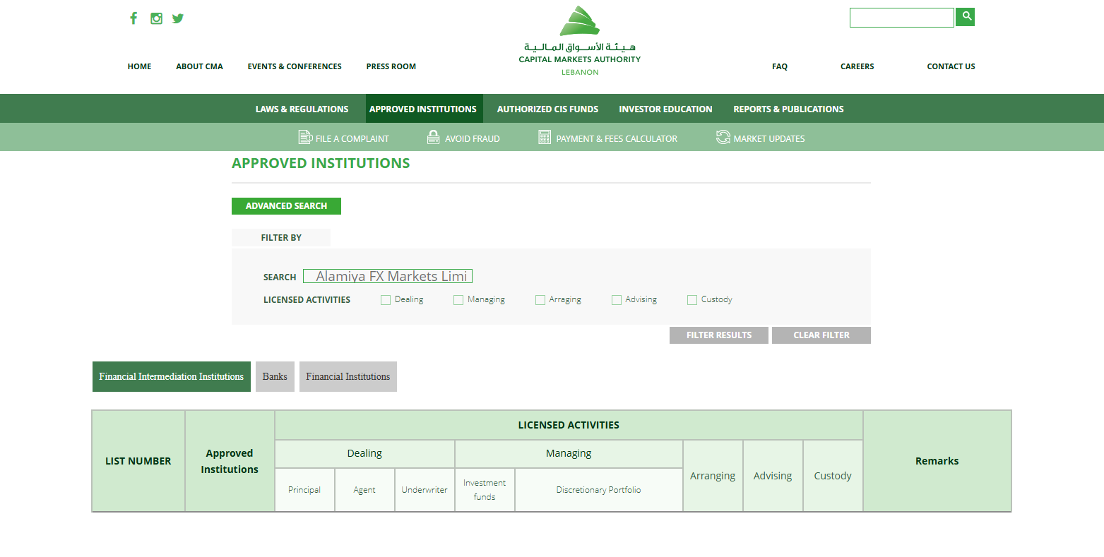 Secondly, we examined the oversight of Lebanon’s Capital Markets Authority (CMA) and found no record of authorization or supervision of this entity. As a result, Alamiya FX Markets operates without oversight from any recognized financial regulatory authority.