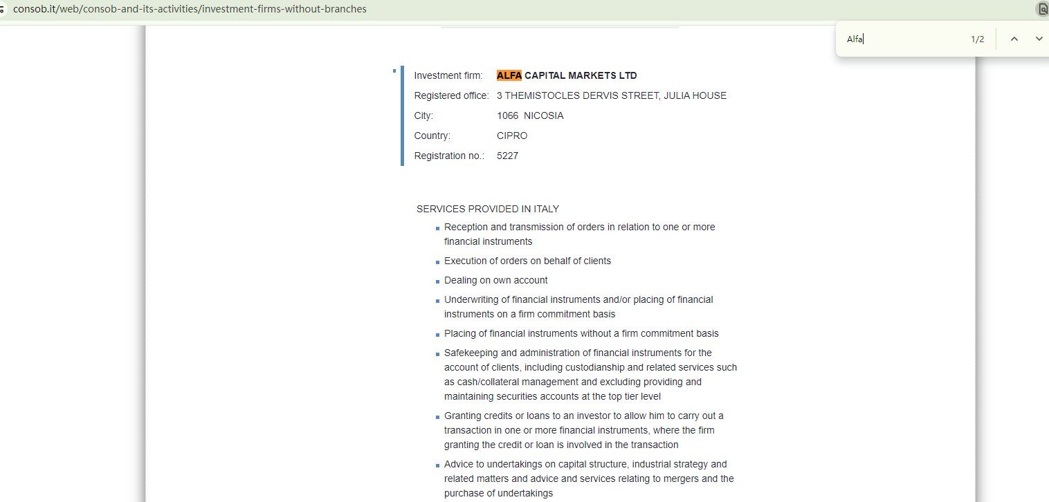 AlfaCapitalMarket merely asserts that it is regulated by the Cyprus Securities and Exchange Commission (CySEC) and the Italian Companies and Exchange Commission (CONSOB), but fails to provide any specific details about its regulatory status.
