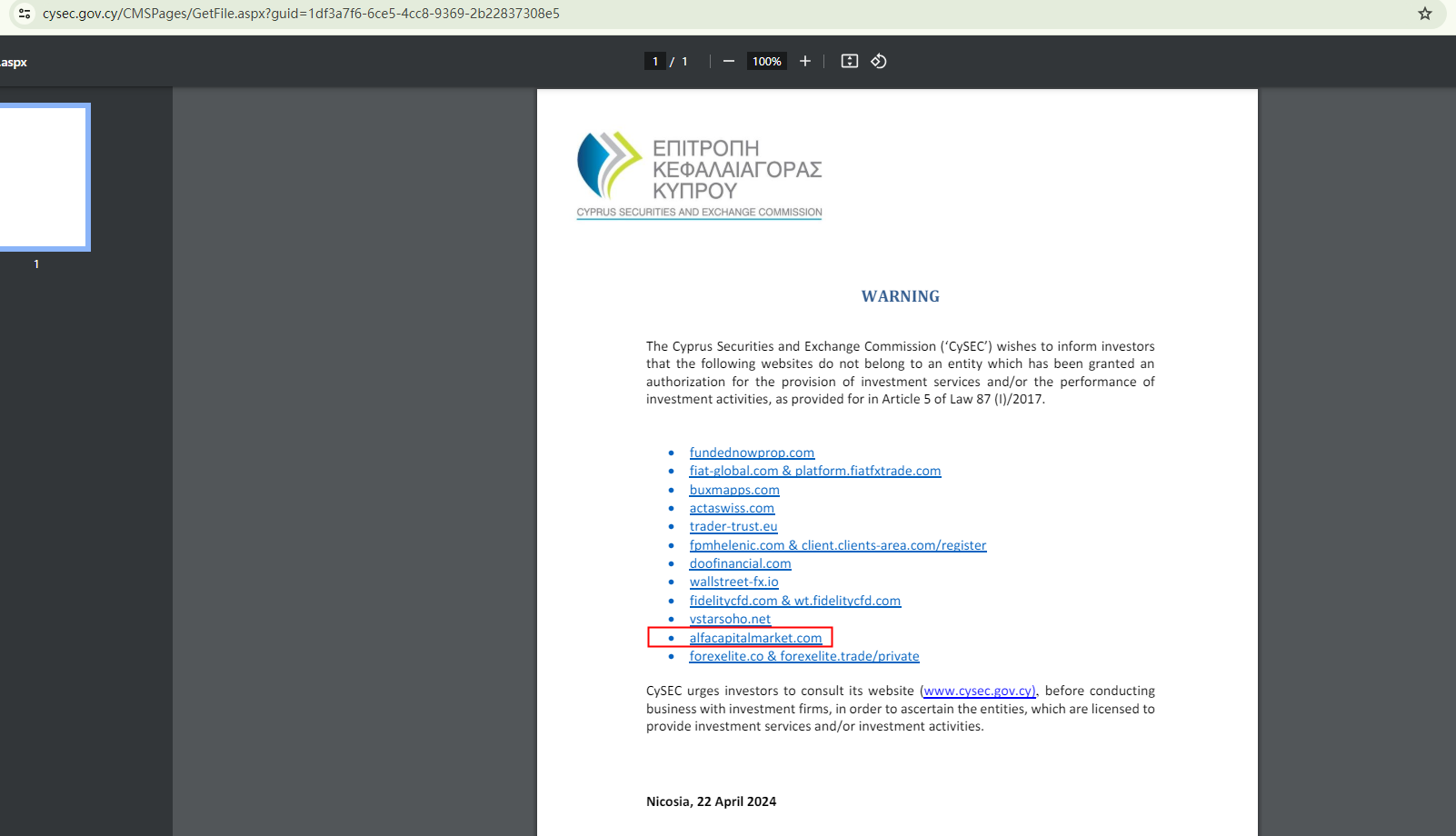 On April 22, 2024, the Cyprus Securities and Exchange Commission (CySEC) added AlfaCapitalMarket to its warning list, stating it does not belong to an entity which has been granted an authorization for the provision of investment services and/or the performance of investment activities. https://www.cysec.gov.cy/CMSPages/GetFile.aspx?guid=1df3a7f6-6ce5-4cc8-9369-2b22837308e5