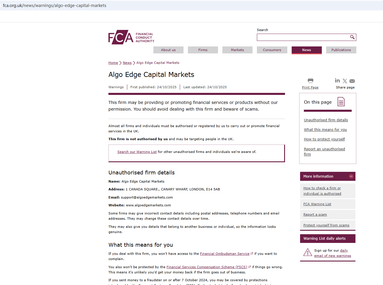 On Oct 24, 2025, the Financial Conduct Authority (FCA) issued a warning regarding Algo Edge Capital Markets, suspecting that this company may be offering financial services or products without the necessary authorization. https://www.fca.org.uk/news/warnings/algo-edge-capital-markets