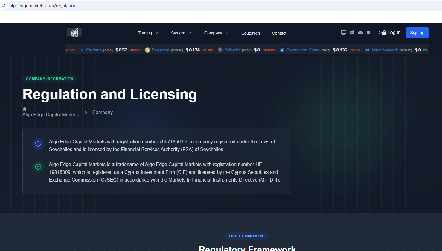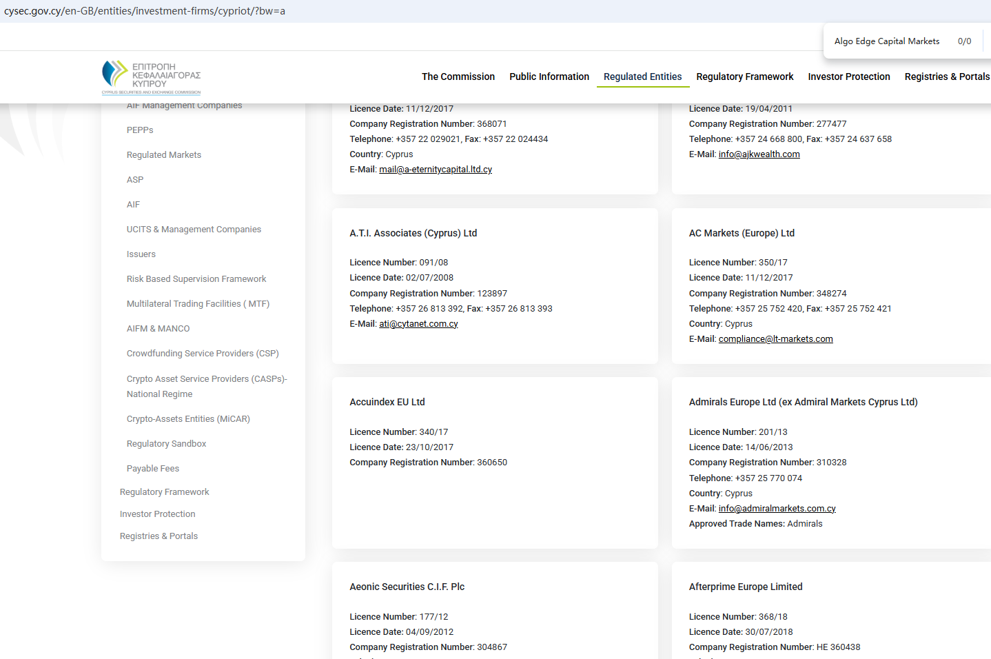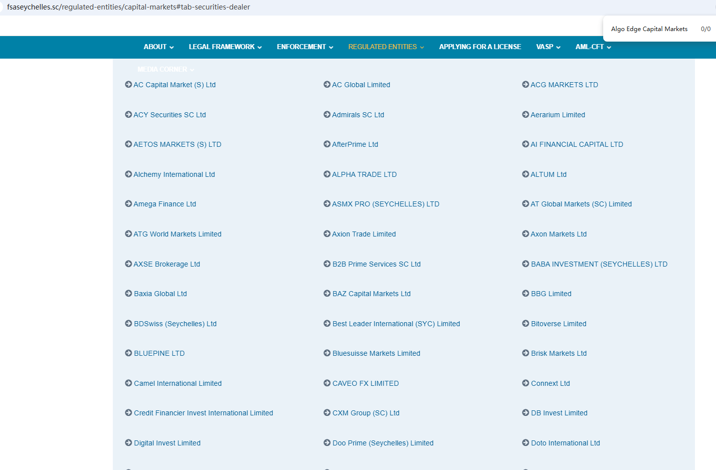 According to its website, it claims to be regulated by the Seychelles Financial Services Authority (Seychelles FSA) and the Cyprus Securities and Exchange Commission (CySEC). Upon investigation, no matching information was found in the Seychelles FSA and CySEC. In addition, the Financial Conduct Authority (FCA) issued a warning regarding Algo Edge Capital Markets, suspecting that this company may be offering financial services or products without the necessary authorization.