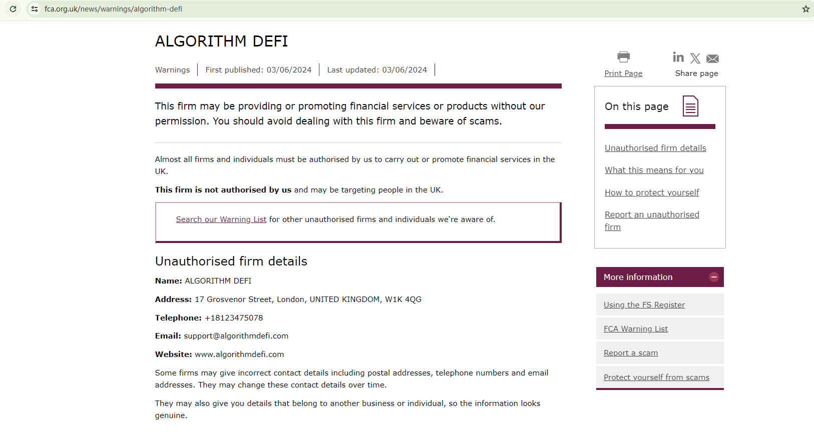 On June 3, 2024, the Financial Conduct Authority (FCA) issued a warning against ALGORITHM DEFI, believing this company might be providing financial services or products without proper authorization in the UK. https://www.fca.org.uk/news/warnings/algorithm-defi